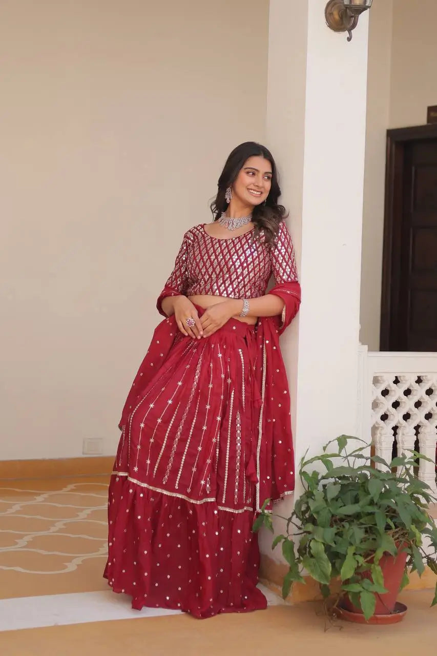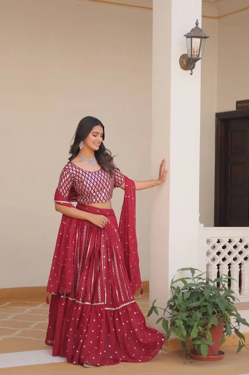This beautifully crafted wedding lehenga choli set is made from pure star georgette, giving it a smooth, elegant drape and a luminous festive look. The choli features detailed 7 mm sequin embroidery with a micro cotton inner for comfort and a polished finish. The matching lehenga carries the same embroidery pattern and a three and a half meter flair that creates graceful movement with every step. The dupatta completes the set with rich embroidered detailing, 7 mm sequence work, and latkan accents that add a traditional touch. Available in two stunning colour options, this set is perfect for weddings, receptions, and grand festive celebrations.