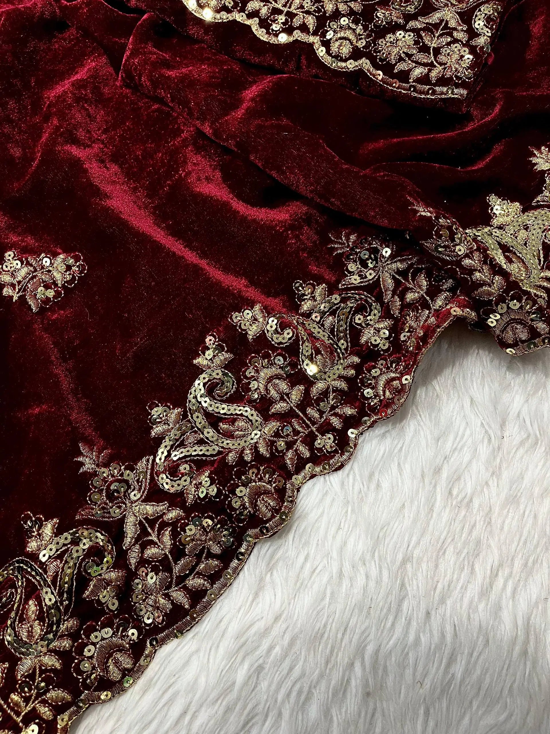 Luxurious Wine Maroon Velvet Saree for Grand Occasions