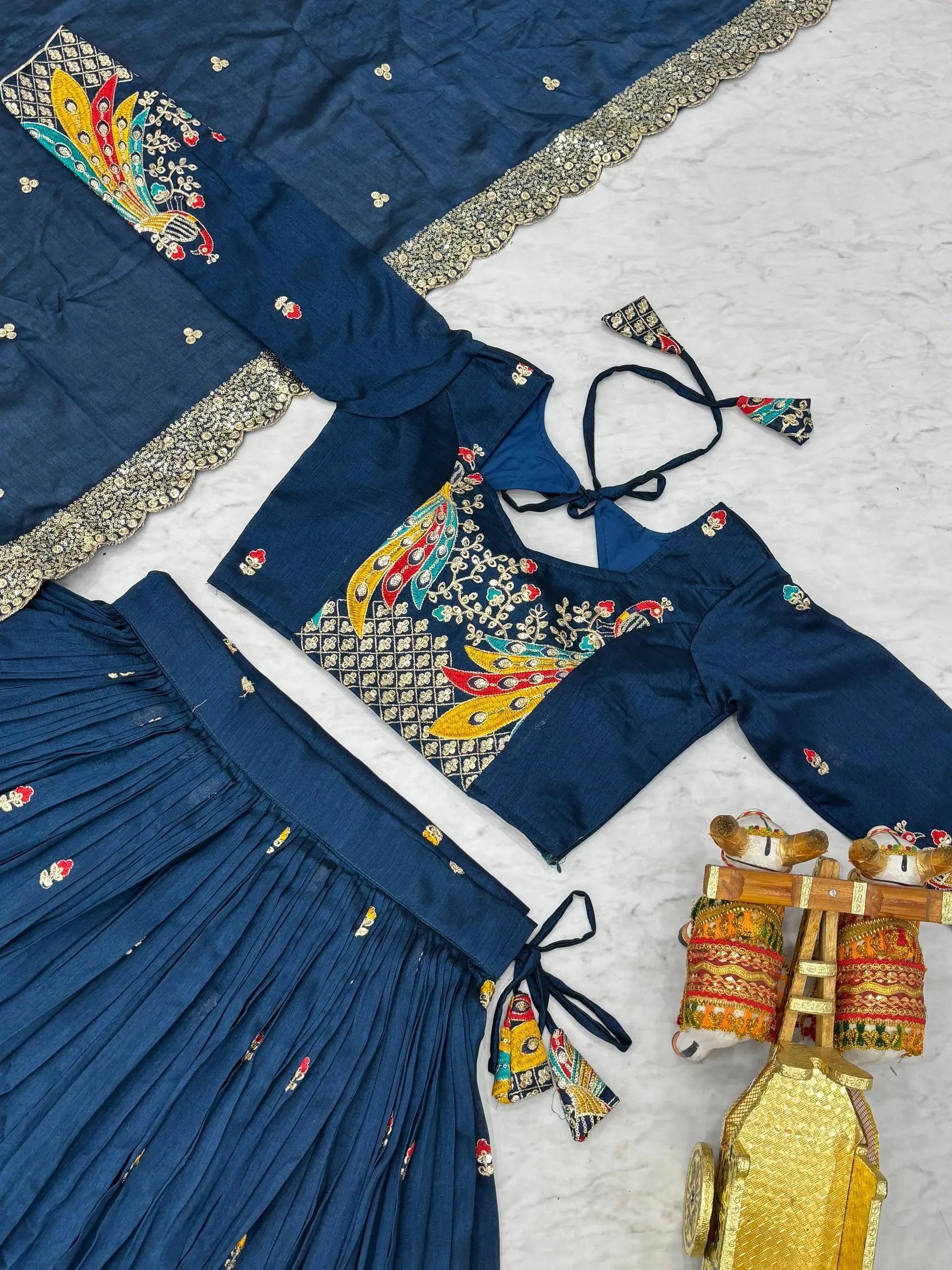 This festive lehenga choli set is crafted from pure vichitra silk, giving it a soft sheen and elegant fall. The choli features heavy embroidery with sequins and thread work, paired with a micro cotton inner for added comfort. The lehenga carries matching embroidery along the border and scattered motifs, supported with canvas and cancan for a well-structured and graceful shape. An adjustable dori ensures a secure fit. The dupatta, also crafted from pure vichitra silk, completes the look with finely embroidered details in 3 mm sequence work. Available in four rich colour options, this set is perfect for festivals, family functions, and wedding events where elegance and comfort matter equally.
