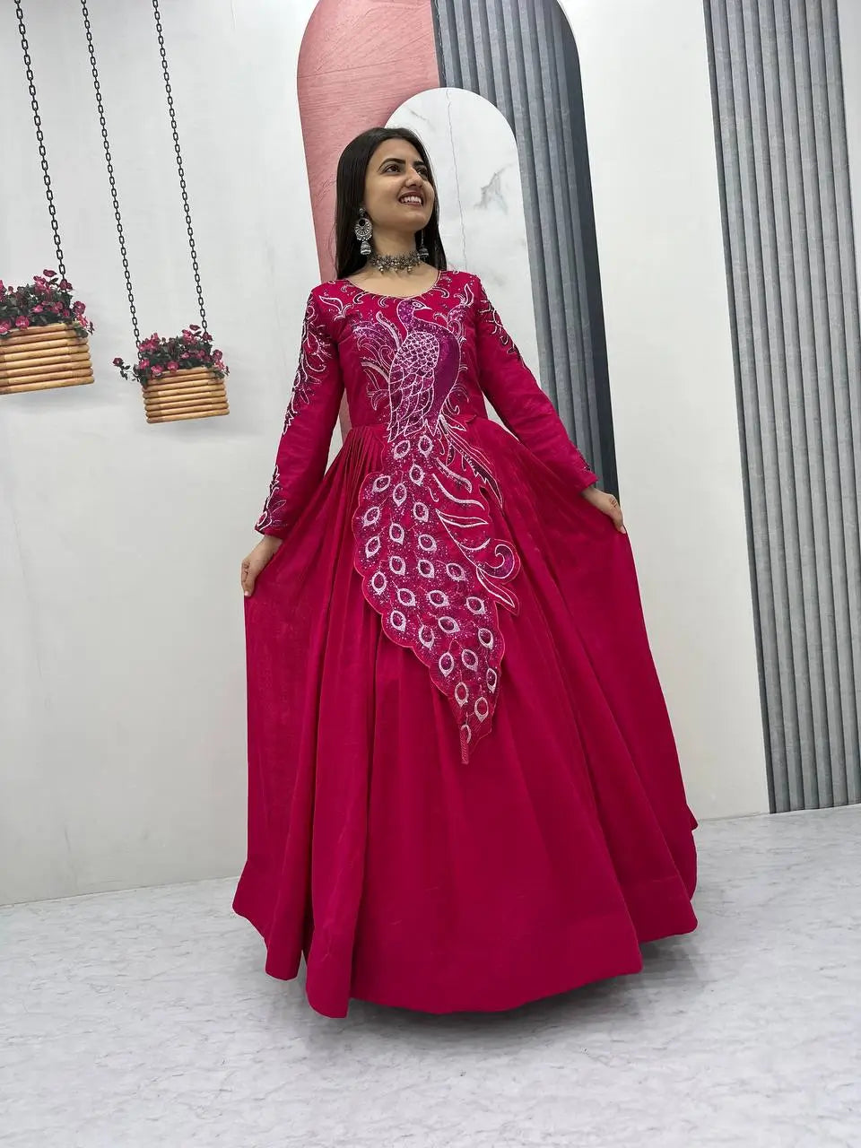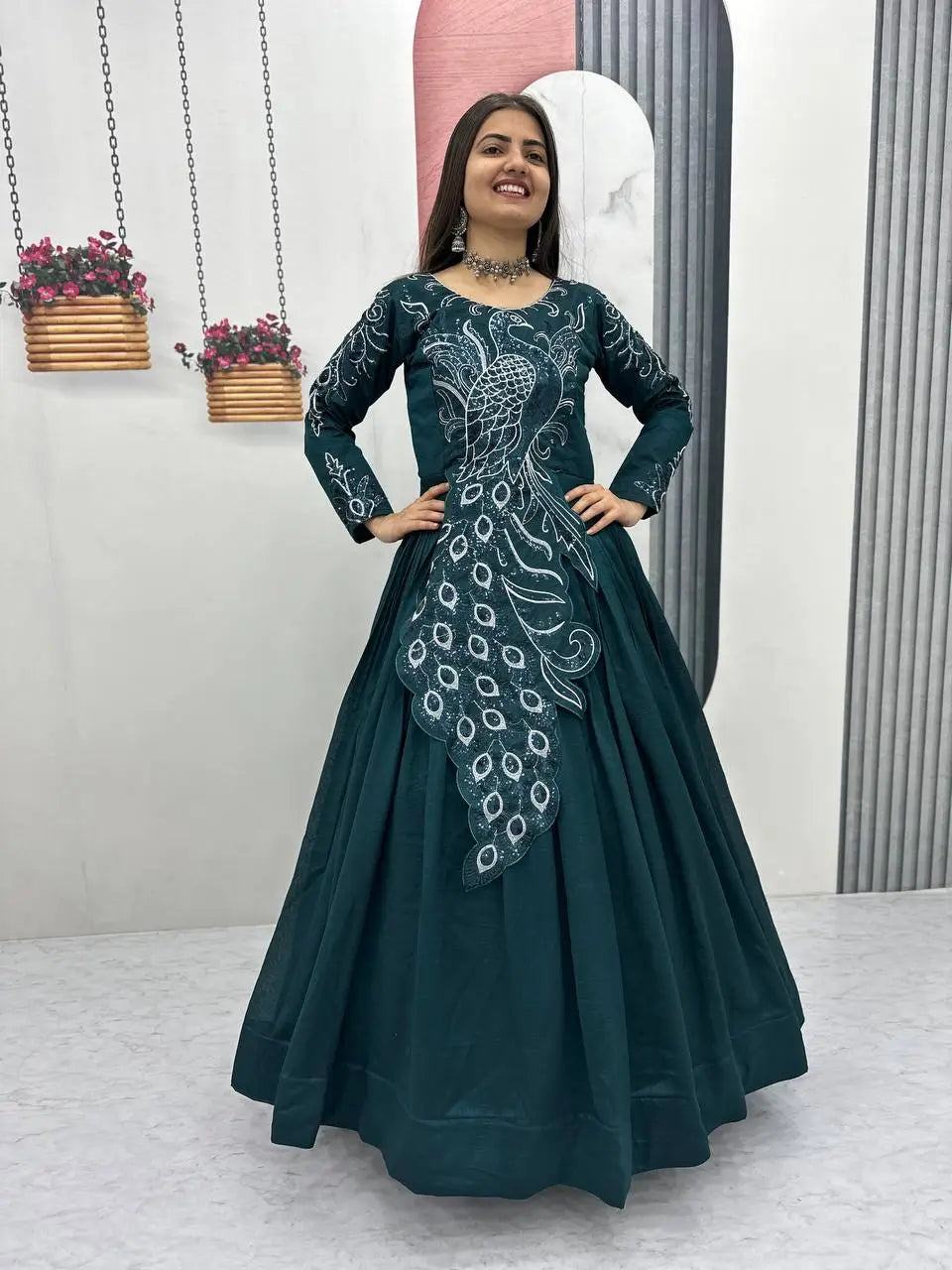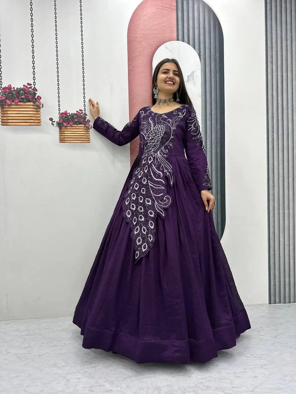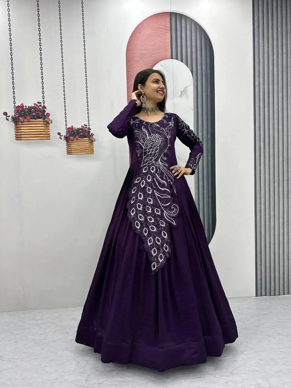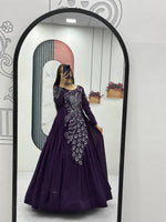 This elegant flared gown is crafted from premium Vichitra silk, designed to offer a rich look with a graceful flow. The gown features heavy embroidery sequins work that adds a striking festive charm while maintaining a refined and balanced appearance. Its generous flare enhances movement and creates a beautiful silhouette, making it ideal for special occasions. Finished with a soft micro cotton inner, this fully stitched gown ensures comfort along with style. Perfect for women who love statement ethnic wear, this gown effortlessly blends traditional elegance with modern appeal.