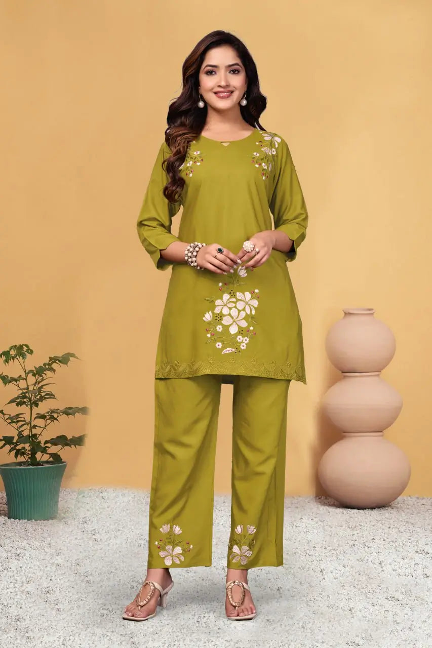 Bring effortless elegance to your wardrobe with this beautifully crafted kurti pant set made from heavy viscose rayon. The kurti features refined multi embroidery thread work enhanced with delicate hand detailing, creating a graceful and contemporary ethnic look. Designed in a comfortable straight silhouette with balanced sleeve length, it offers ease of movement while maintaining a polished appearance. The matching pant is tailored in the same premium viscose rayon fabric and finished with coordinated embroidery thread work, completing the ensemble with a clean and stylish finish. This set is ideal for festive gatherings, weddings, and special occasions where comfort and elegance go hand in hand.