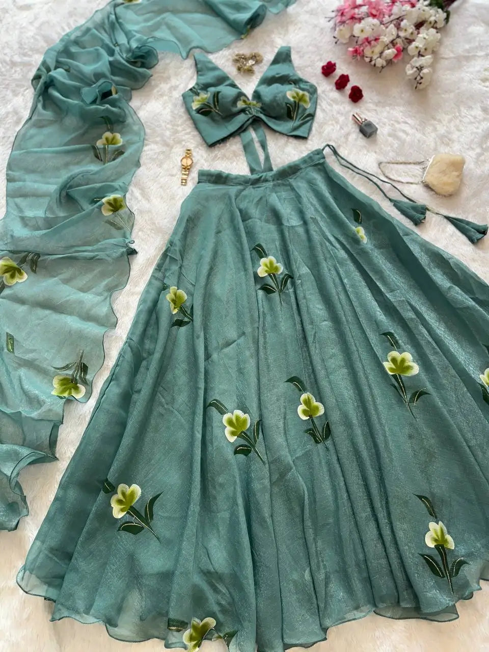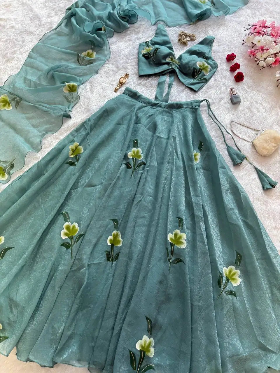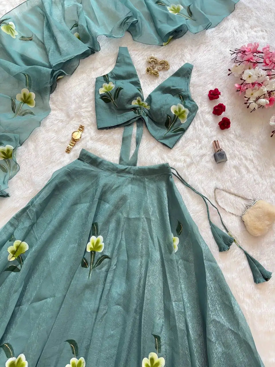 Step into modern elegance with this Fandy Crush Handpaint Lehenga Set, crafted for weddings, festive celebrations, and special occasions. The blouse is fully stitched, padded, and designed with a stylish back pattern, featuring handpainted floral detailing for a unique artistic touch. The lehenga offers a voluminous 8-meter flair with a sturdy canvas patta for structure, beautifully enhanced with matching handpaint work. Completing the ensemble is a flowing cascade-style dupatta, also handpainted to perfection. This exclusive set blends handcrafted artistry with a contemporary silhouette, making it a standout choice for your ethnic wardrobe.