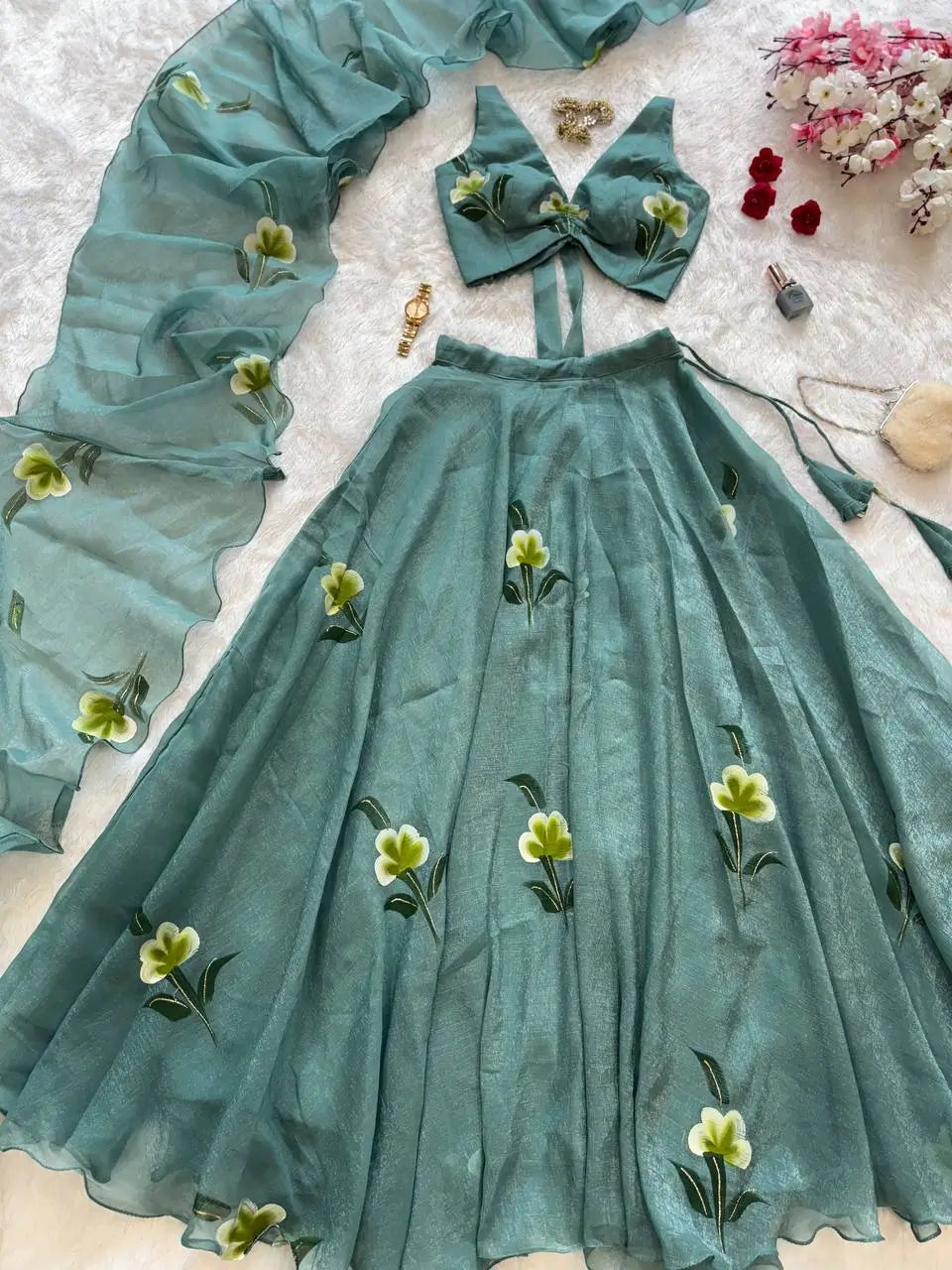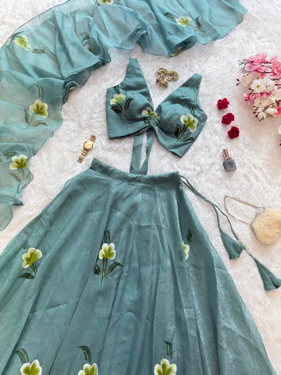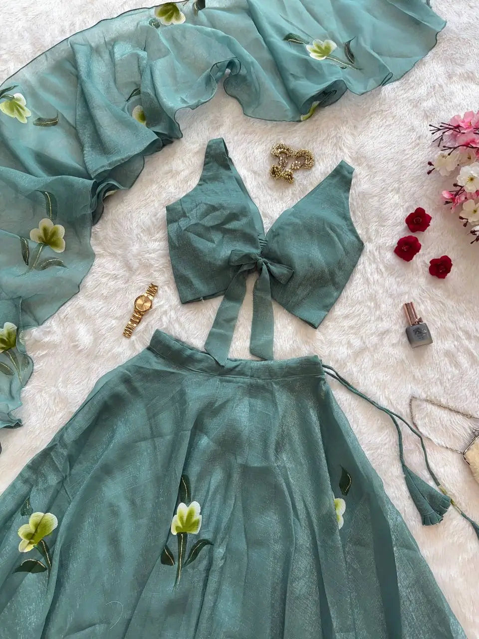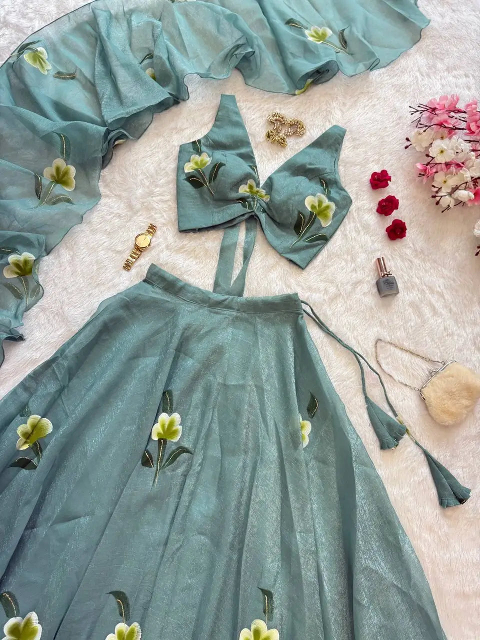 Step into modern elegance with this Fandy Crush Handpaint Lehenga Set, crafted for weddings, festive celebrations, and special occasions. The blouse is fully stitched, padded, and designed with a stylish back pattern, featuring handpainted floral detailing for a unique artistic touch. The lehenga offers a voluminous 8-meter flair with a sturdy canvas patta for structure, beautifully enhanced with matching handpaint work. Completing the ensemble is a flowing cascade-style dupatta, also handpainted to perfection. This exclusive set blends handcrafted artistry with a contemporary silhouette, making it a standout choice for your ethnic wardrobe.