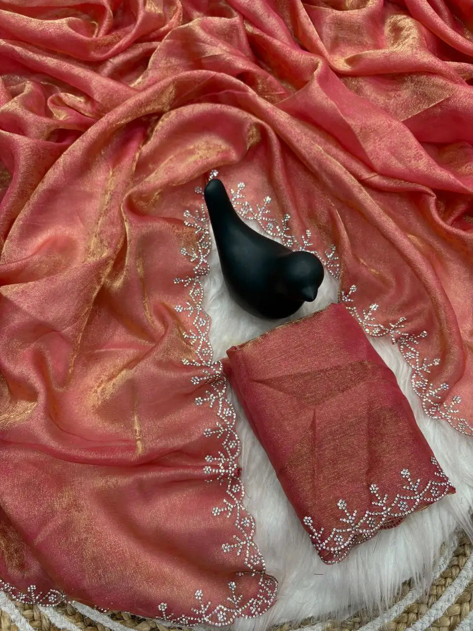 This Fandy satin saree is a perfect expression of understated elegance and timeless charm. Crafted from premium Fandy satin, it features a subtle self-weaving zari pattern that adds a rich, sophisticated sheen to the fabric. The saree is beautifully finished with a sparkling Siroski stone border that lends a touch of glamour without overpowering its graceful look. It comes with a matching running blouse piece adorned with a Siroski border for a coordinated finish. Ideal for festive gatherings, weddings, and elegant evening occasions, this saree effortlessly combines traditional artistry with modern refinement.