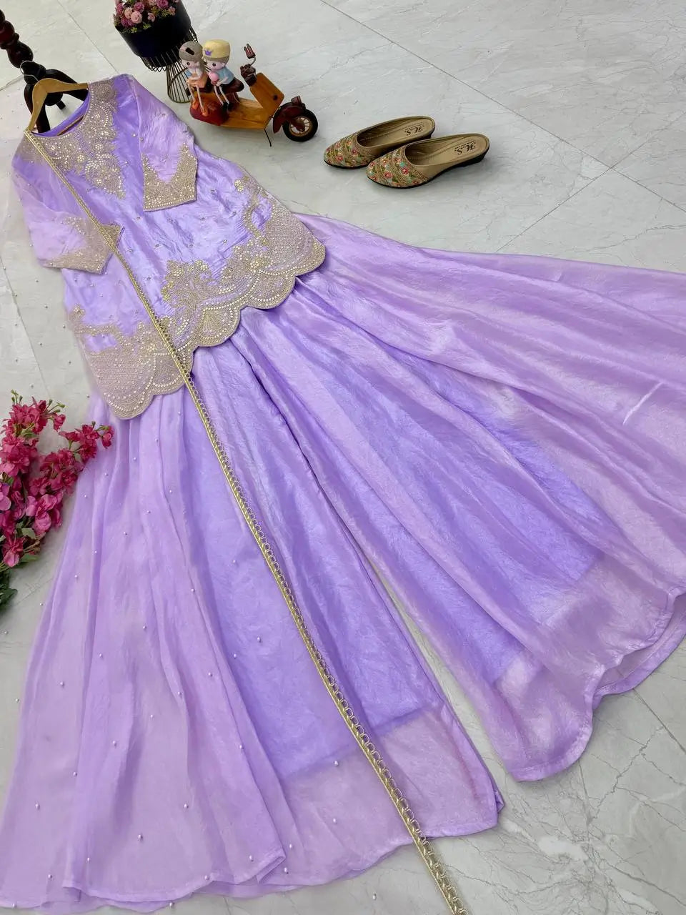 This outfit is a must-have for women searching for a lavender kurti palazzo set online, perfect for parties, festive wear, engagement functions, and wedding gatherings.