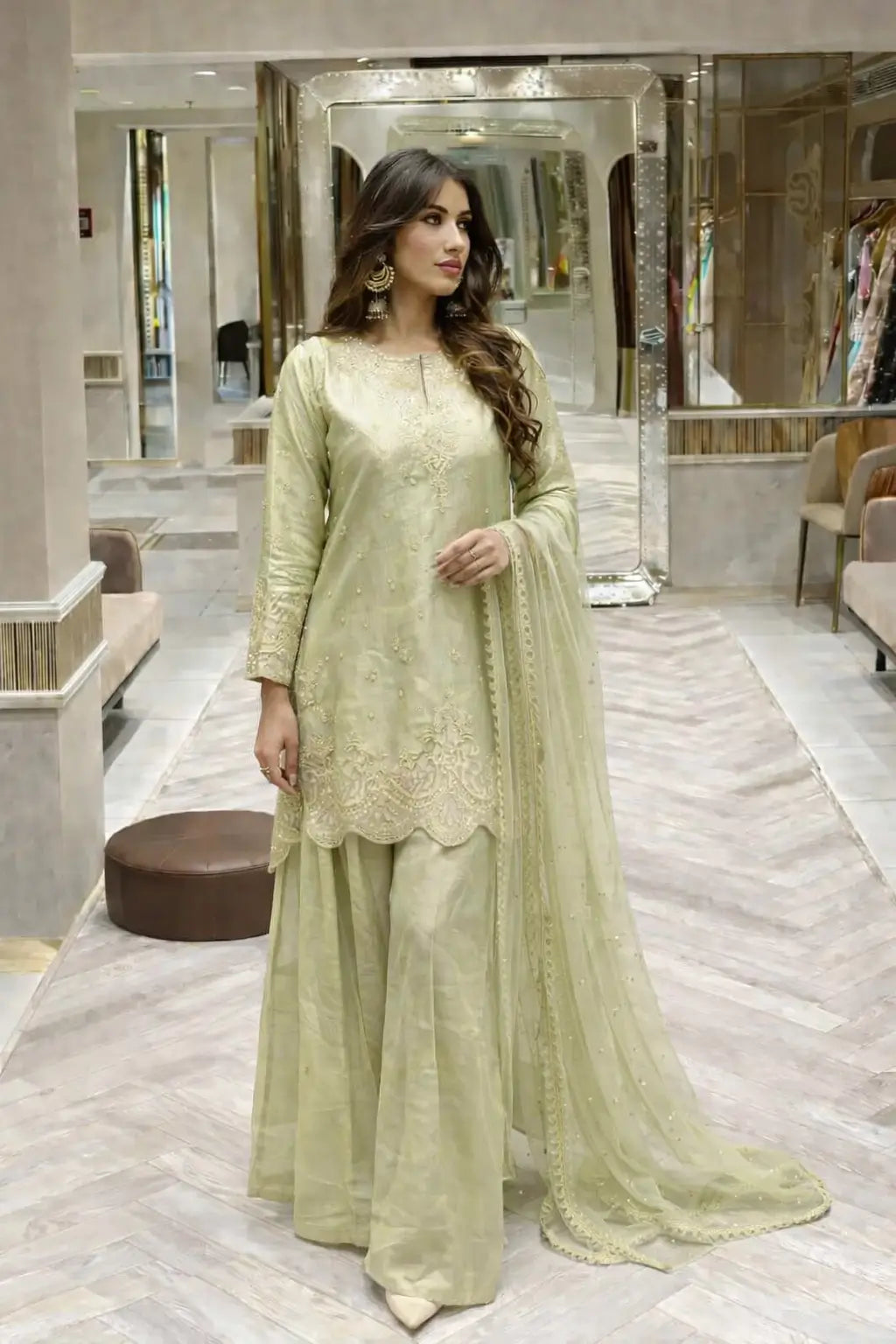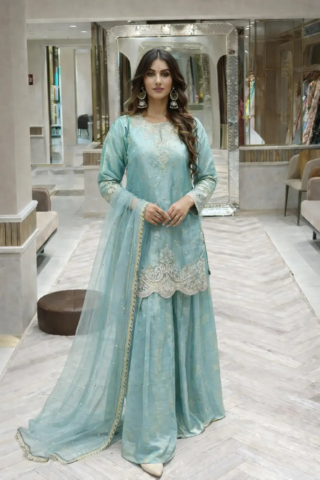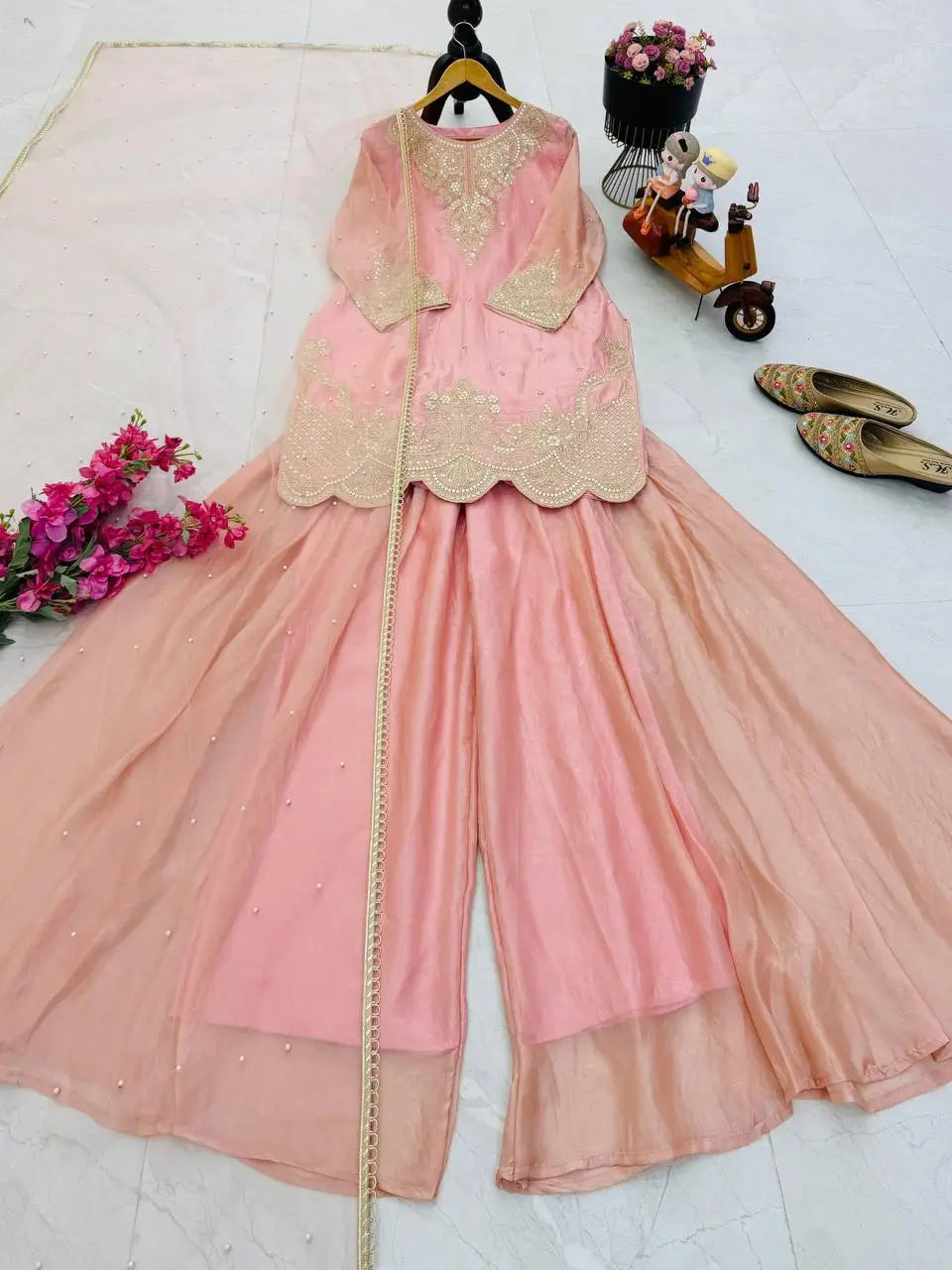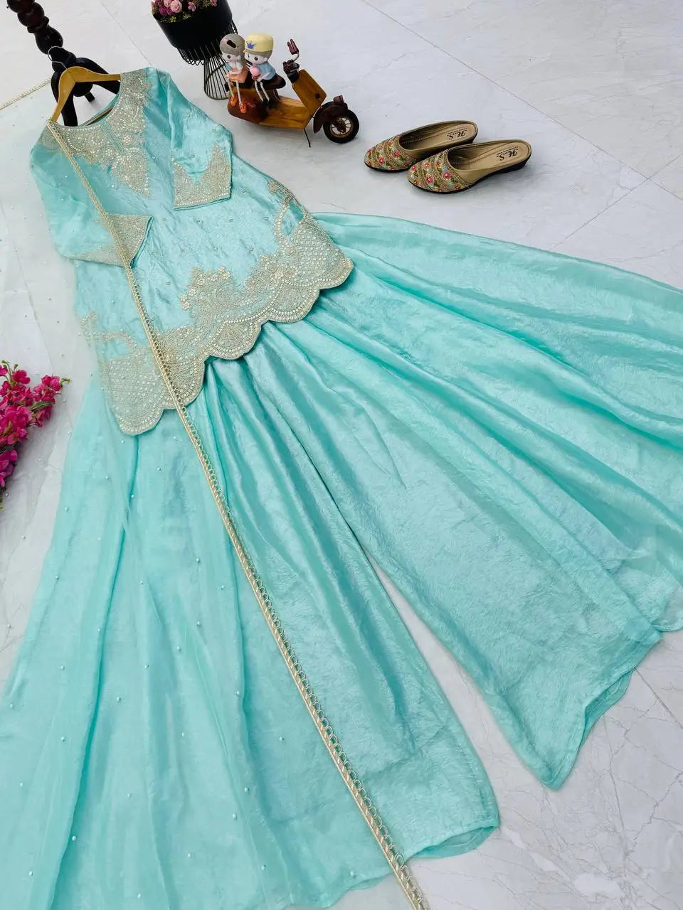 Fandy Silk Embroidered Sequin Diamond Handwork Kurti Palazzo Set with Net Moti Dupatta | Party Festive Wear