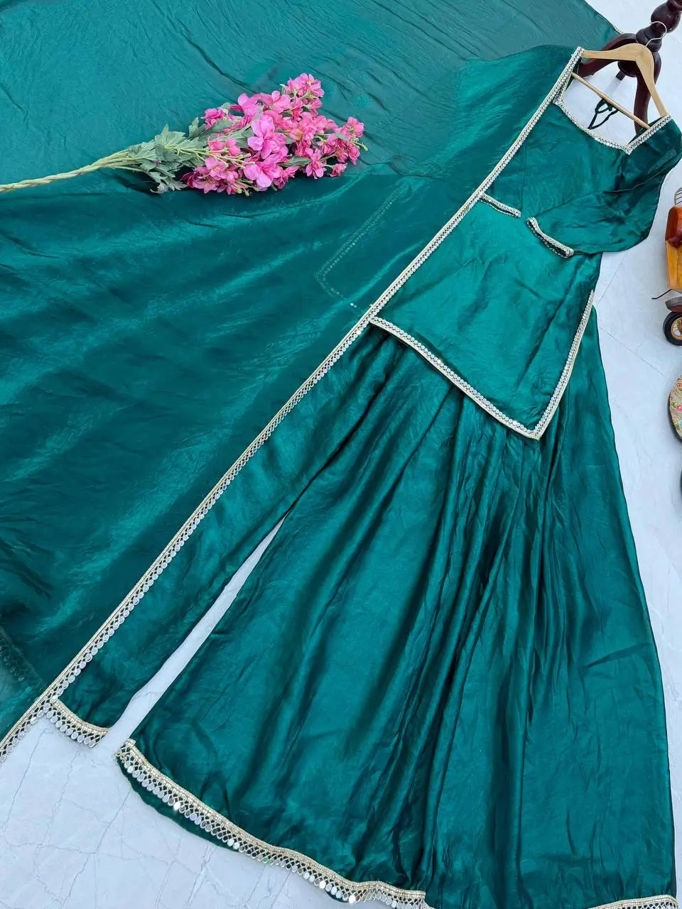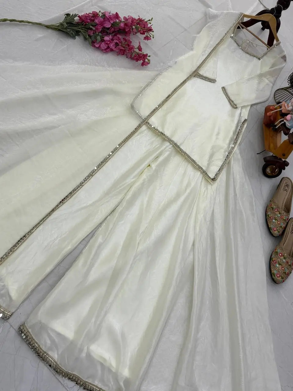 This outfit is a great pick for women looking for a mirror work kurti palazzo set, ideal for festivals, parties, family functions, and traditional gatherings.