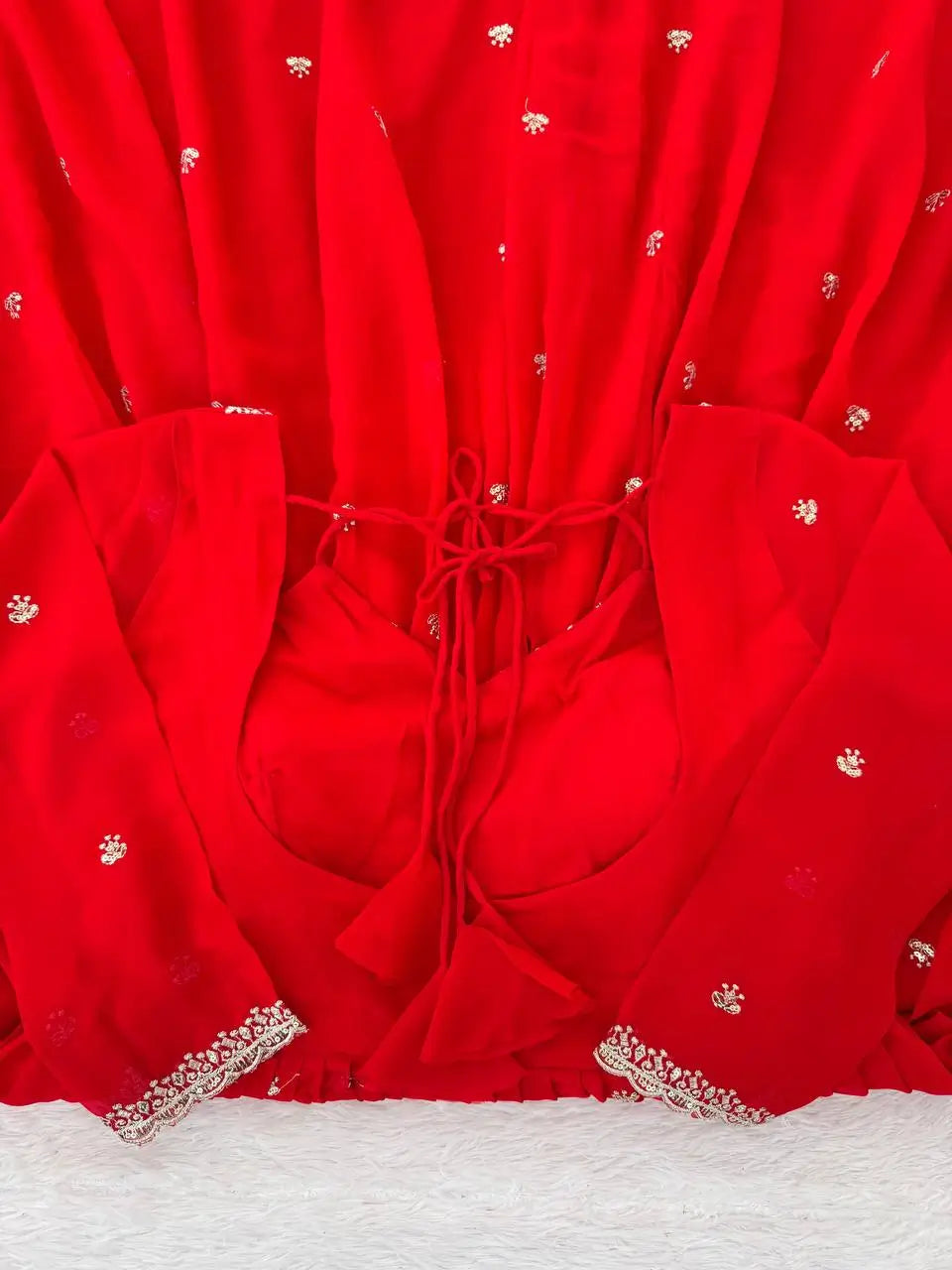 Grace your festive and wedding occasions with this elegant Faux Georgette Anarkali Set, designed with comfort and style in mind. The Anarkali is crafted from premium faux georgette fabric, lined with soft micro cotton, and beautifully adorned with delicate thread and sequin embroidery. With a 52-inch length and a grand 4-meter flair, it creates a graceful, flowy silhouette perfect for celebrations. The set comes with a fully stitched micro cotton pant, featuring a stretchable elastic waist for a comfortable fit up to size 44. Completing the ensemble is a faux georgette dupatta embellished with thread and sequin work and finished with a four-side lace border, measuring 2.2 meters. Lightweight at just 1 kg, this Anarkali set is ideal for weddings, parties, and festive gatherings.