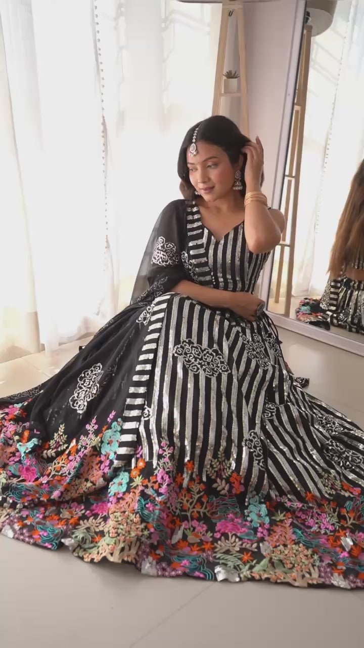 Bring grace and glamour to your festive wardrobe with this faux georgette lehenga set crafted with exquisite detailing. The lehenga features thread embroidery with sequin work over soft faux georgette, finished with a 3-meter flair, canvas patta, and cancan for a voluminous and elegant silhouette.