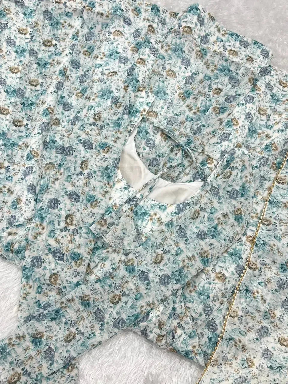 The set is paired with a 27-inch wide shawl-style dupatta in chiffon floral print, finished with triangle lace border, adding a graceful drape. Completing the look is a free-size fully stitched micro cotton silk pant, making this outfit a ready-to-wear ensemble available in sizes XS (34) to XXL (44).