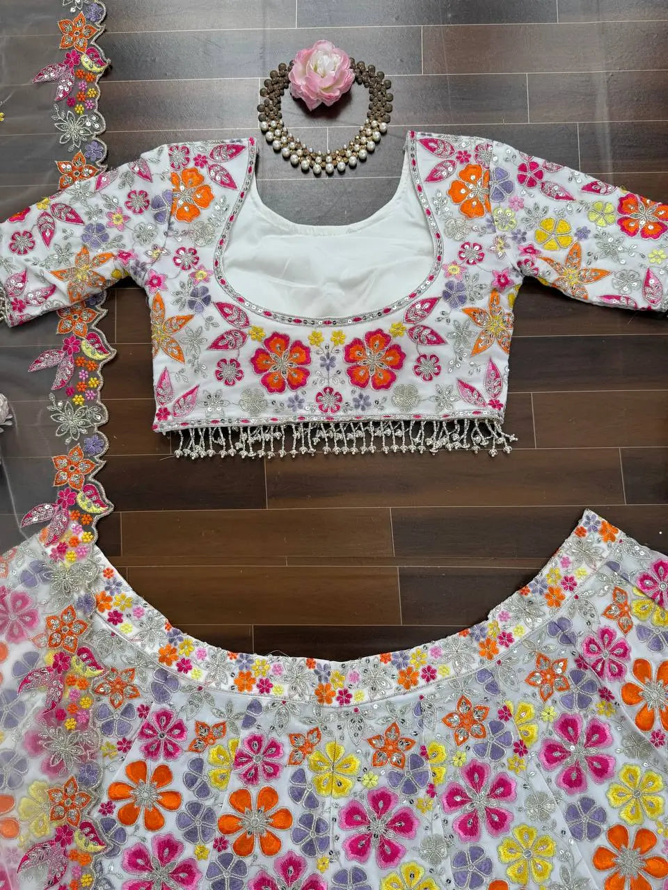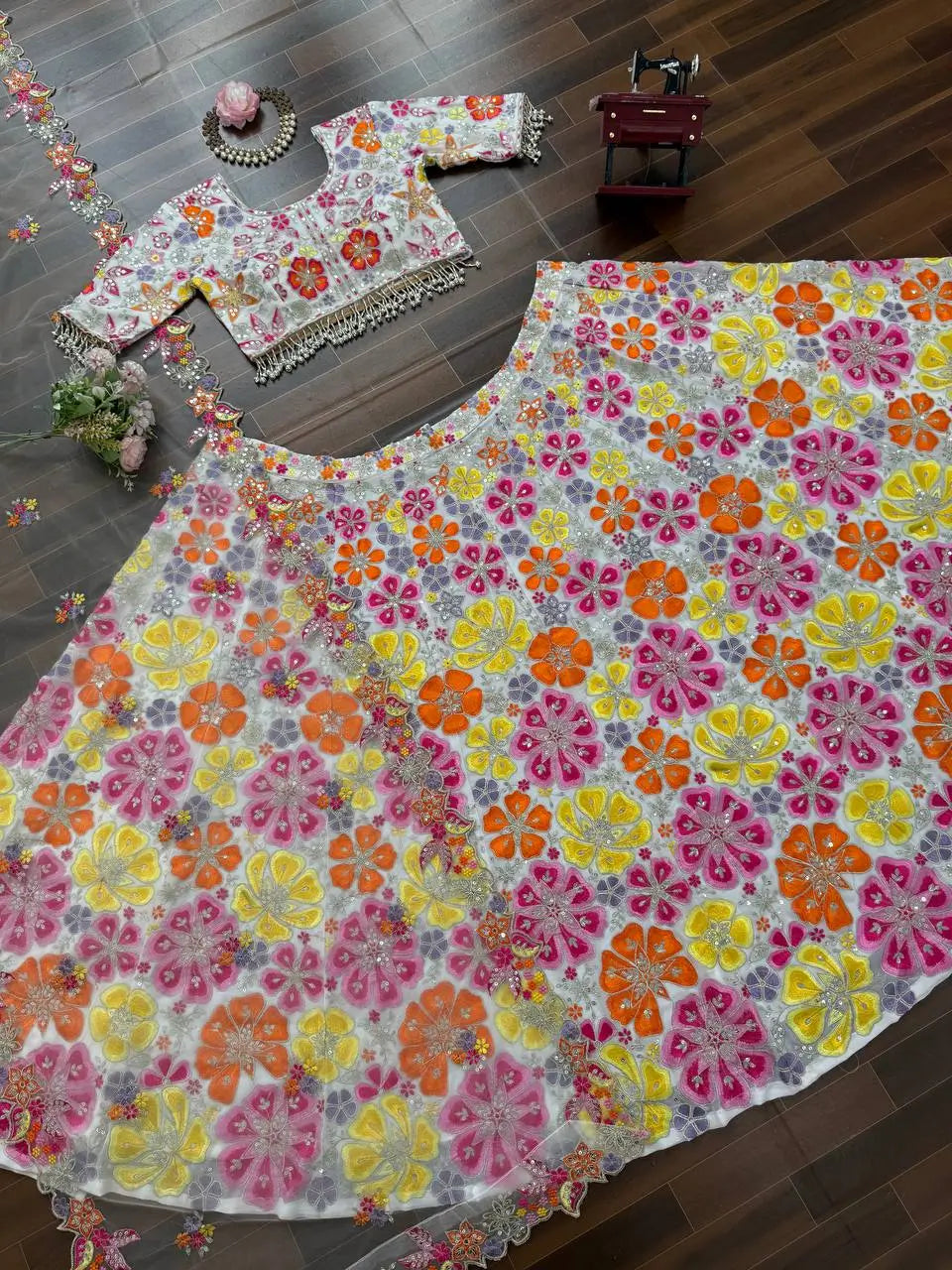 This floral embroidered georgette lehenga set is crafted for vibrant celebrations and effortless elegance. The faux georgette fabric offers graceful movement while the intricate thread and sequin work adds a festive shimmer. The lehenga comes fully stitched for convenience and includes soft micro lining along with cancan and canvas support, giving the skirt a beautifully voluminous flair.
