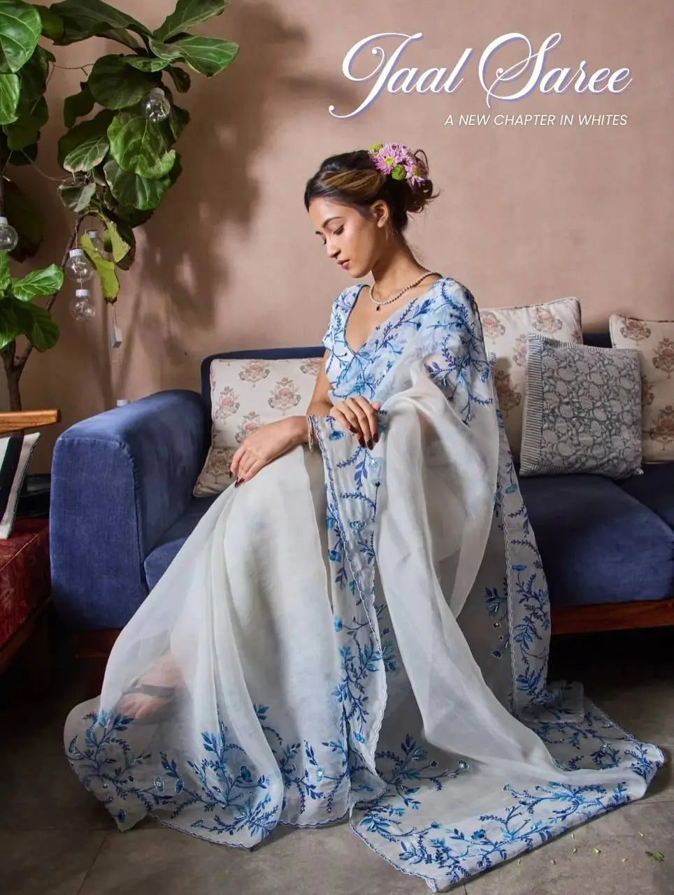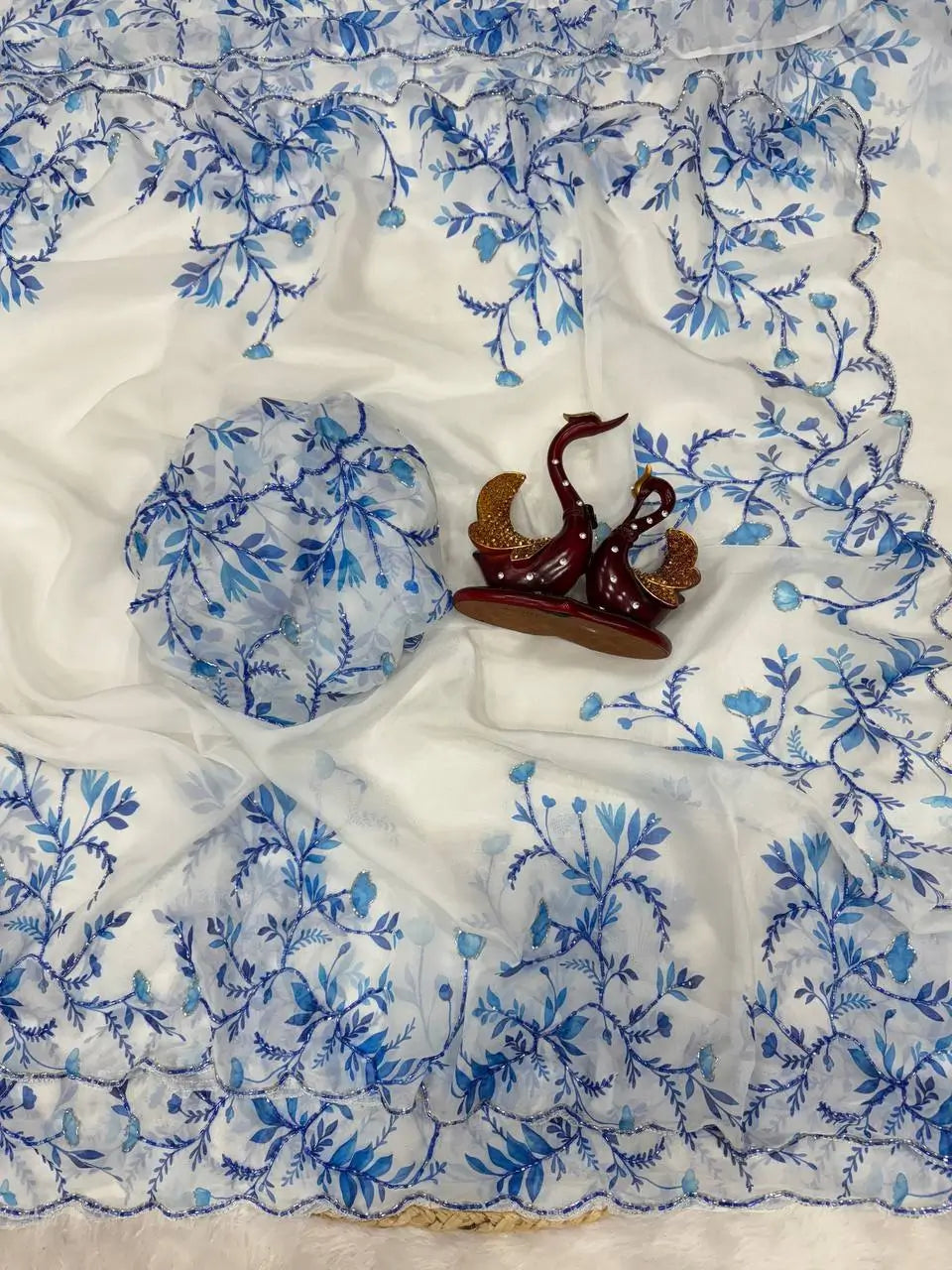The saree features floral print enhanced with beads and katdana handwork.