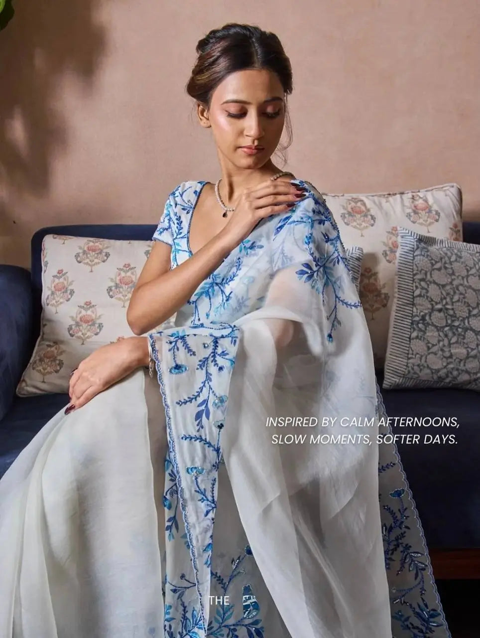 The saree is made from soft tebby silk, known for its smooth texture and elegant fall.