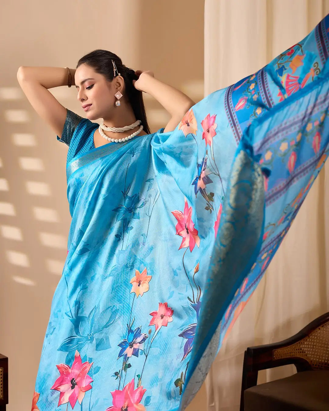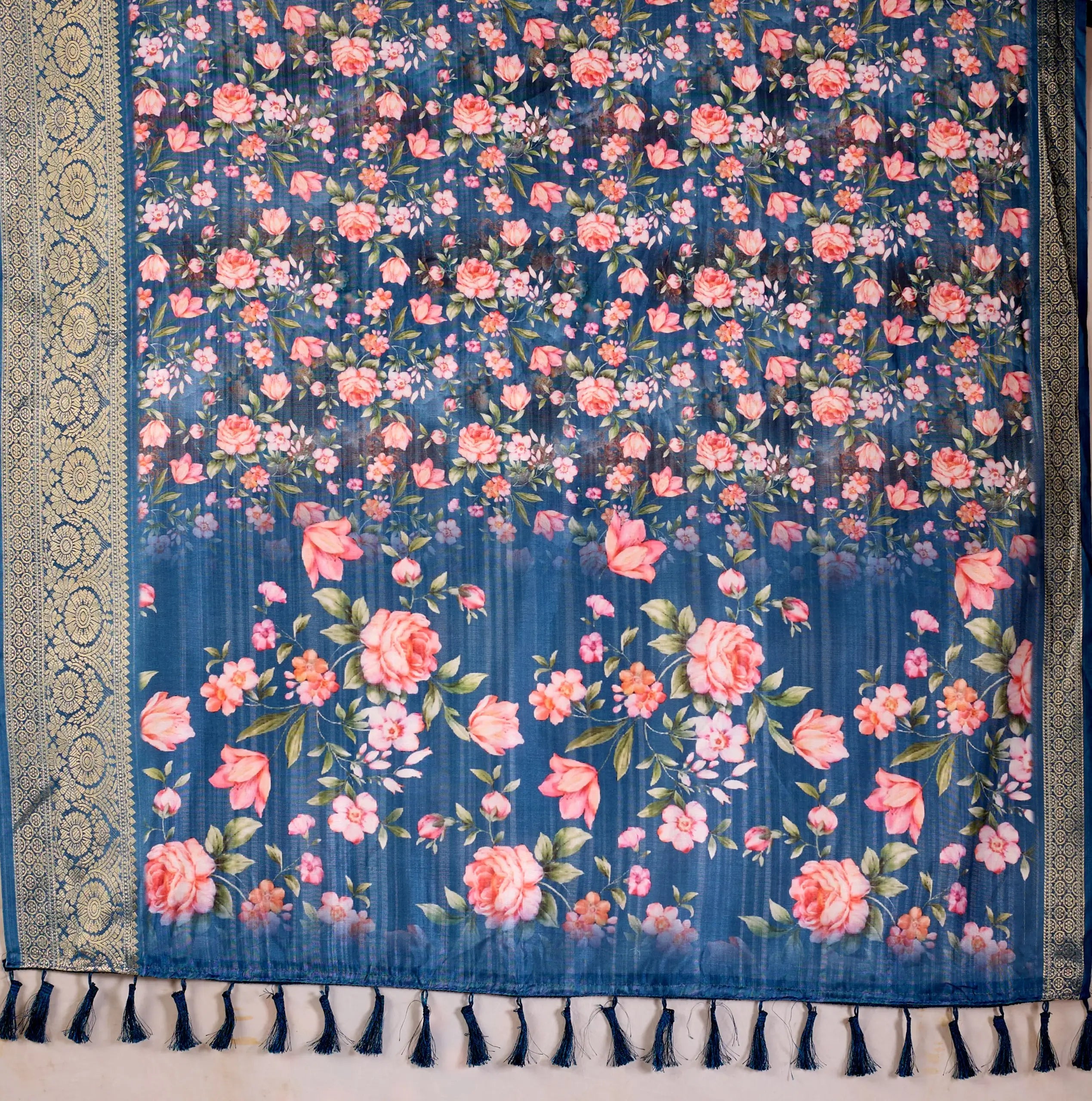 This elegant saree is crafted from soft lichi silk, offering a smooth texture and a graceful drape ideal for festive gatherings and special occasions. The deep teal blue base is enhanced with romantic rose floral digital prints that add charm, richness, and a touch of modern artistry. An intricately woven golden zari border completes the saree with a traditional finish, creating a perfect balance of contemporary beauty and classic elegance.