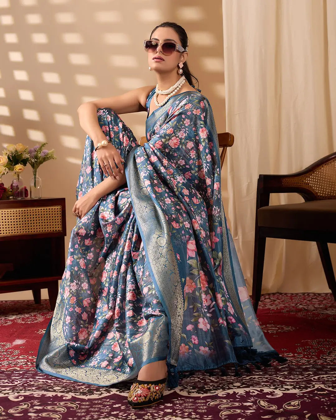 This elegant saree is crafted from soft lichi silk, offering a smooth texture and a graceful drape ideal for festive gatherings and special occasions. The deep teal blue base is enhanced with romantic rose floral digital prints that add charm, richness, and a touch of modern artistry. An intricately woven golden zari border completes the saree with a traditional finish, creating a perfect balance of contemporary beauty and classic elegance.