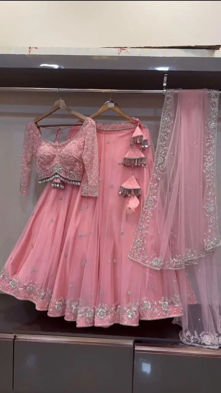 Step into elegance with this beautifully designed Fox Georgette Lehenga Set, perfect for weddings, receptions, and festive celebrations. Crafted from premium fox georgette fabric, the lehenga is adorned with delicate thread and sequin embroidery. With a voluminous 3.5-meter flair supported by canvas patta and cancan, it creates a graceful, royal silhouette. The lehenga comes semi-stitched, allowing customization up to size 44, and is lined with soft micro fabric for comfort. The blouse (choli) is made of fox georgette with matching embroidery, provided unstitched for tailoring up to size 44. Completing the look is a soft butterfly net dupatta, highlighted with embroidery, sequin work, and a four-side fancy lace border, measuring 2.2 meters. With a lightweight finish of just 1.5 kg, this lehenga ensures effortless wear while keeping the style regal.