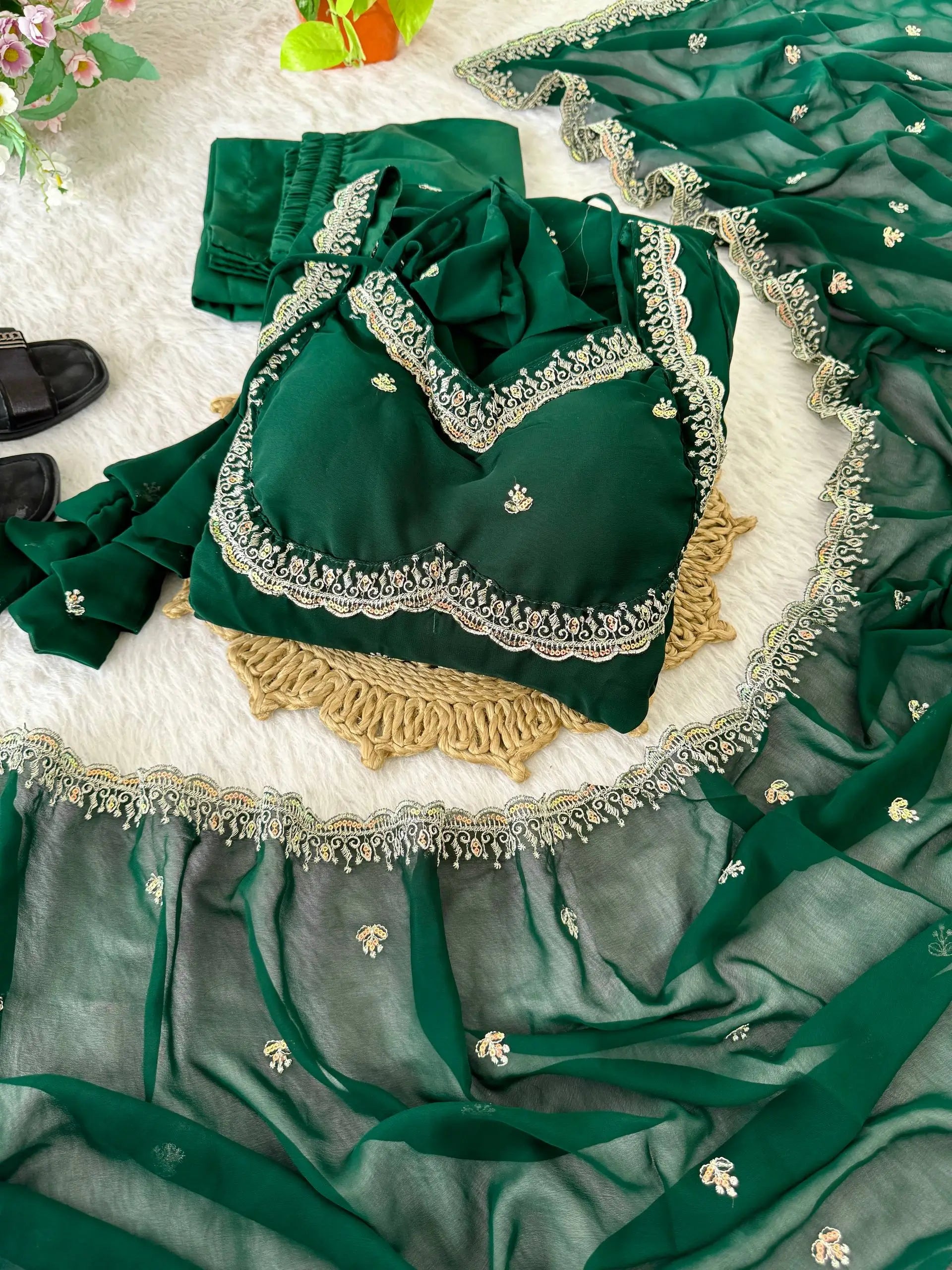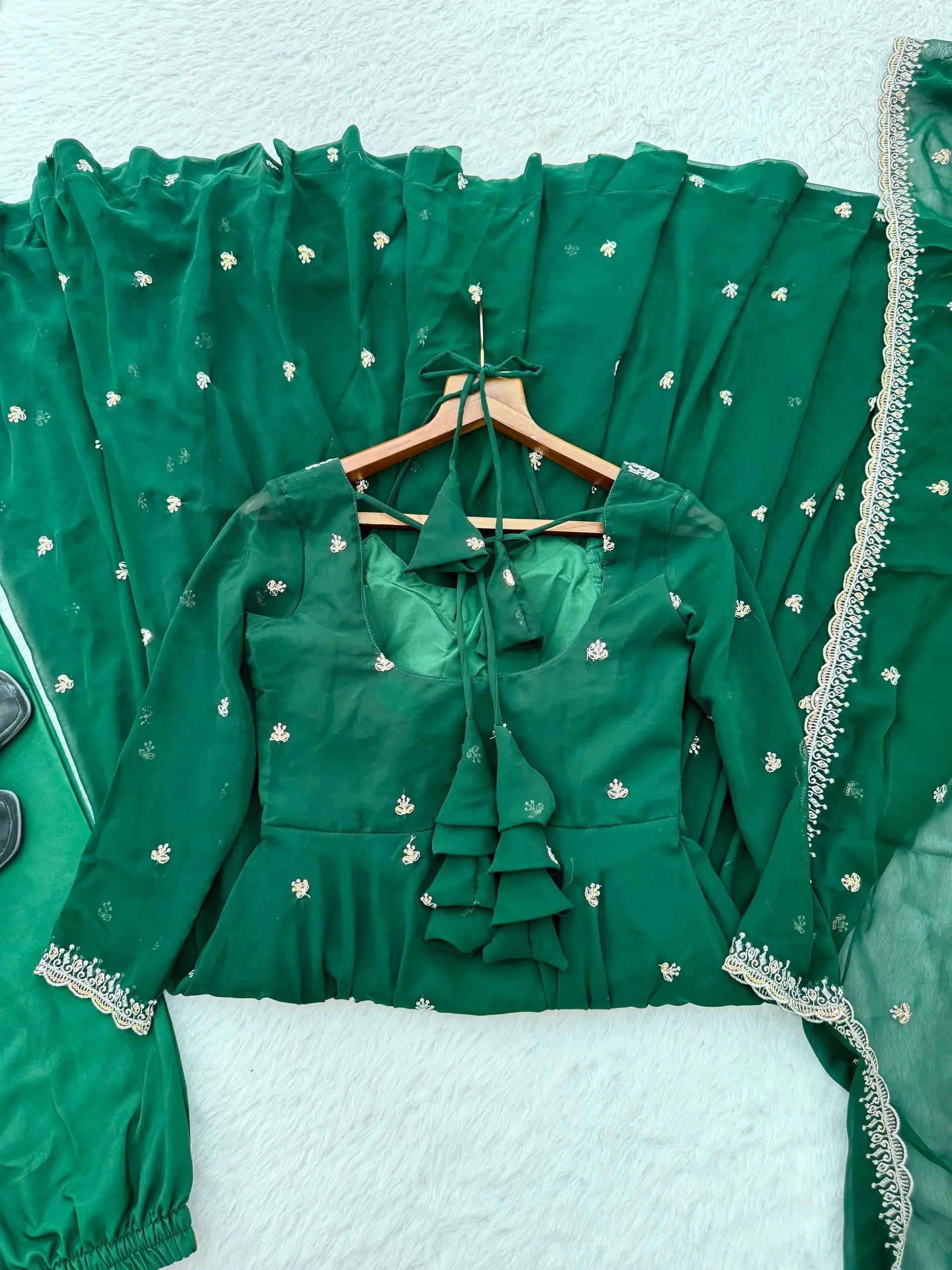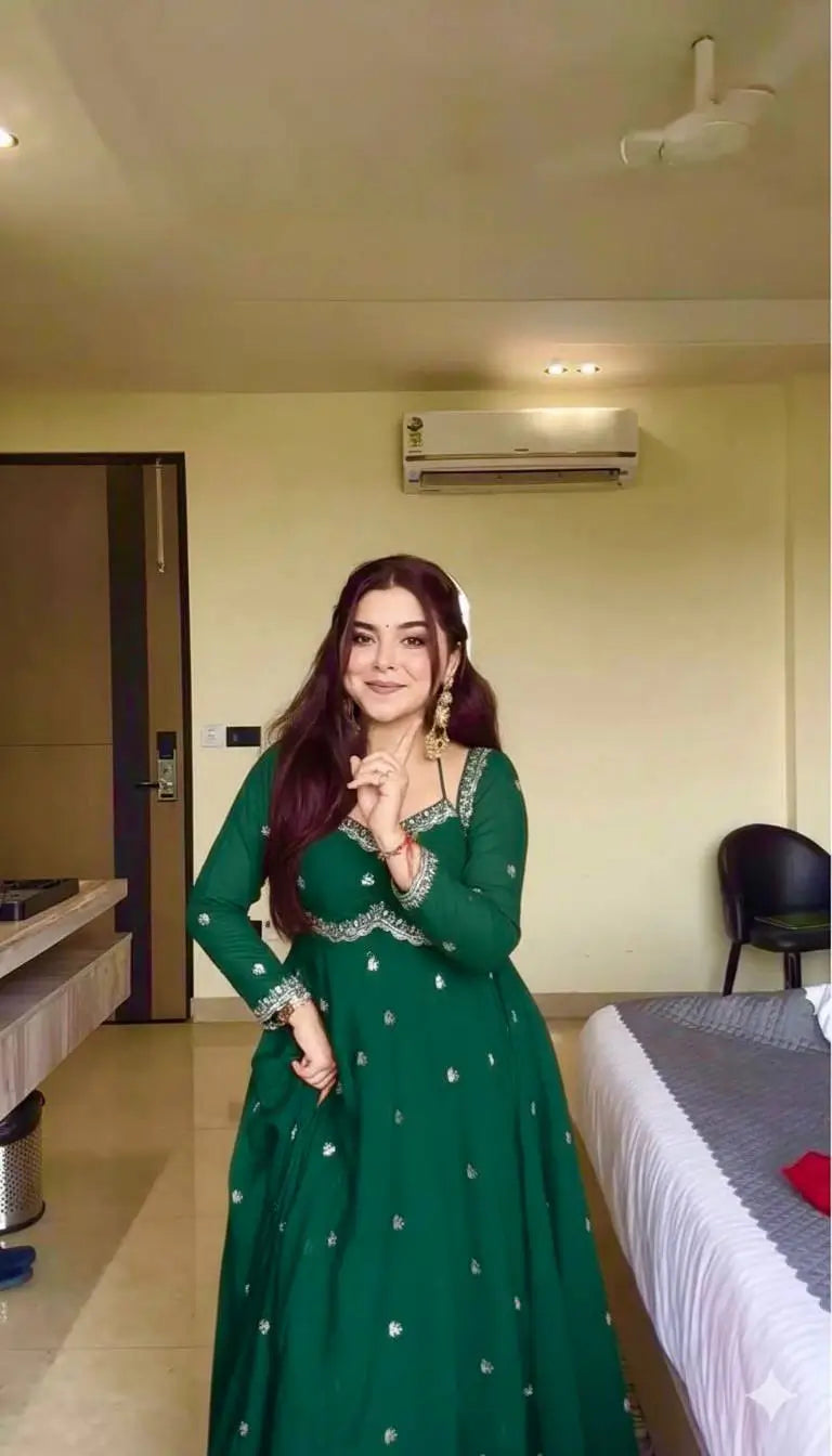 This elegant umbrella gown set is crafted from heavy fox georgette and features intricate rembo sequence embroidery with zari detailing on the neckline and sleeves. The gown includes a soft American butter cotton inner for comfort and structure, paired with a grand four meter umbrella flair that creates a graceful and flowy silhouette.
