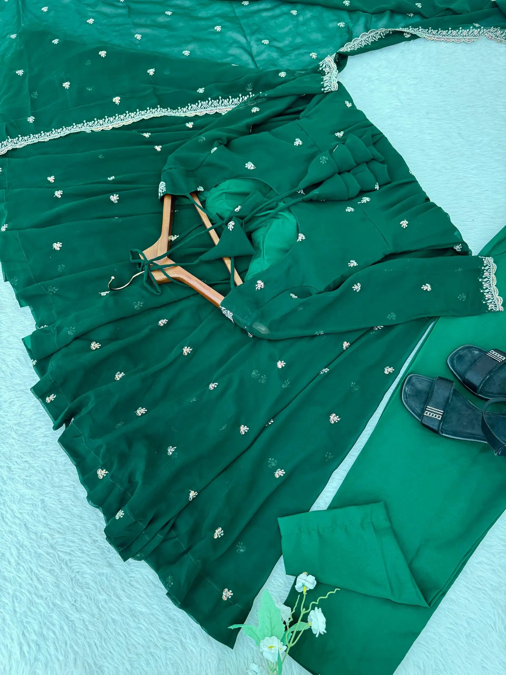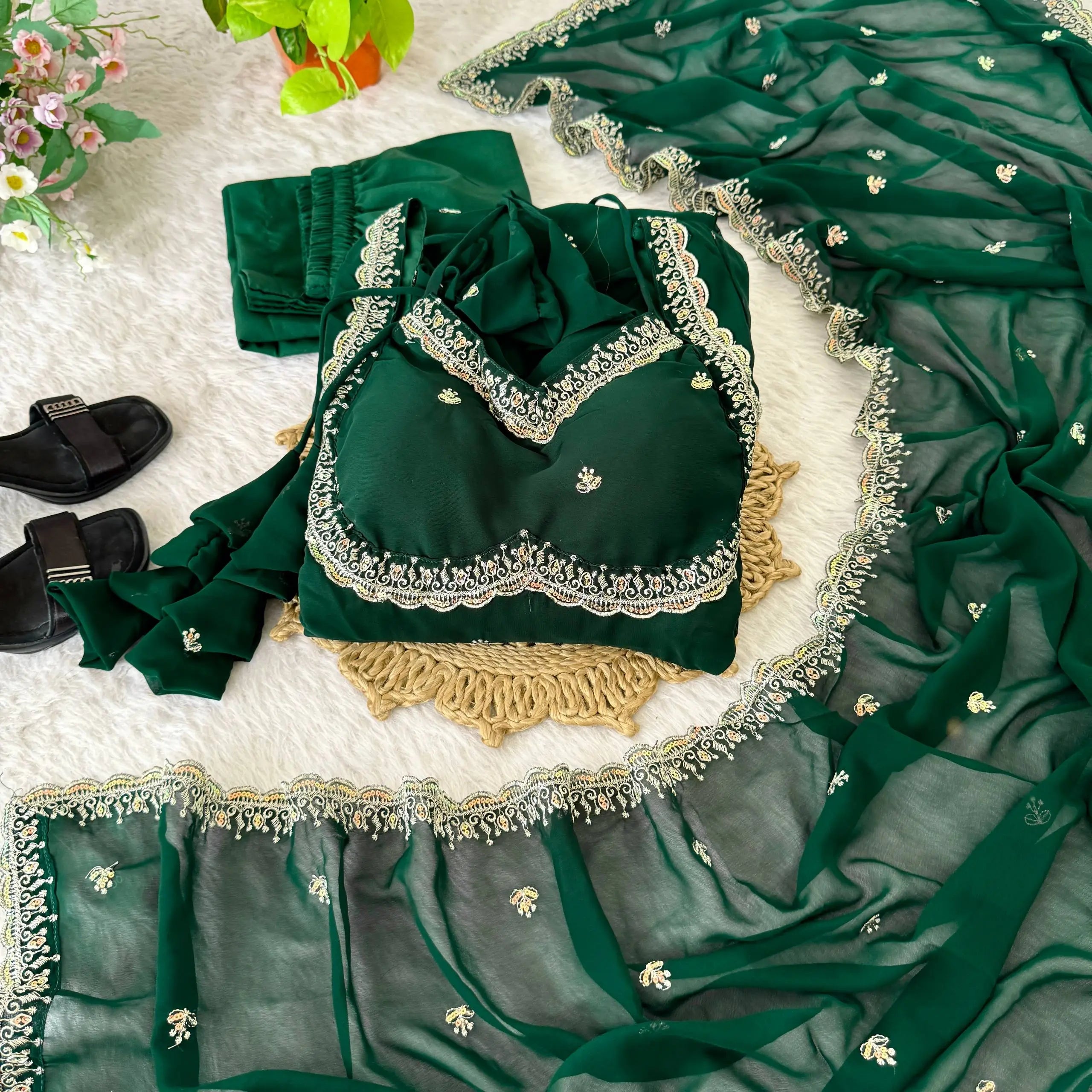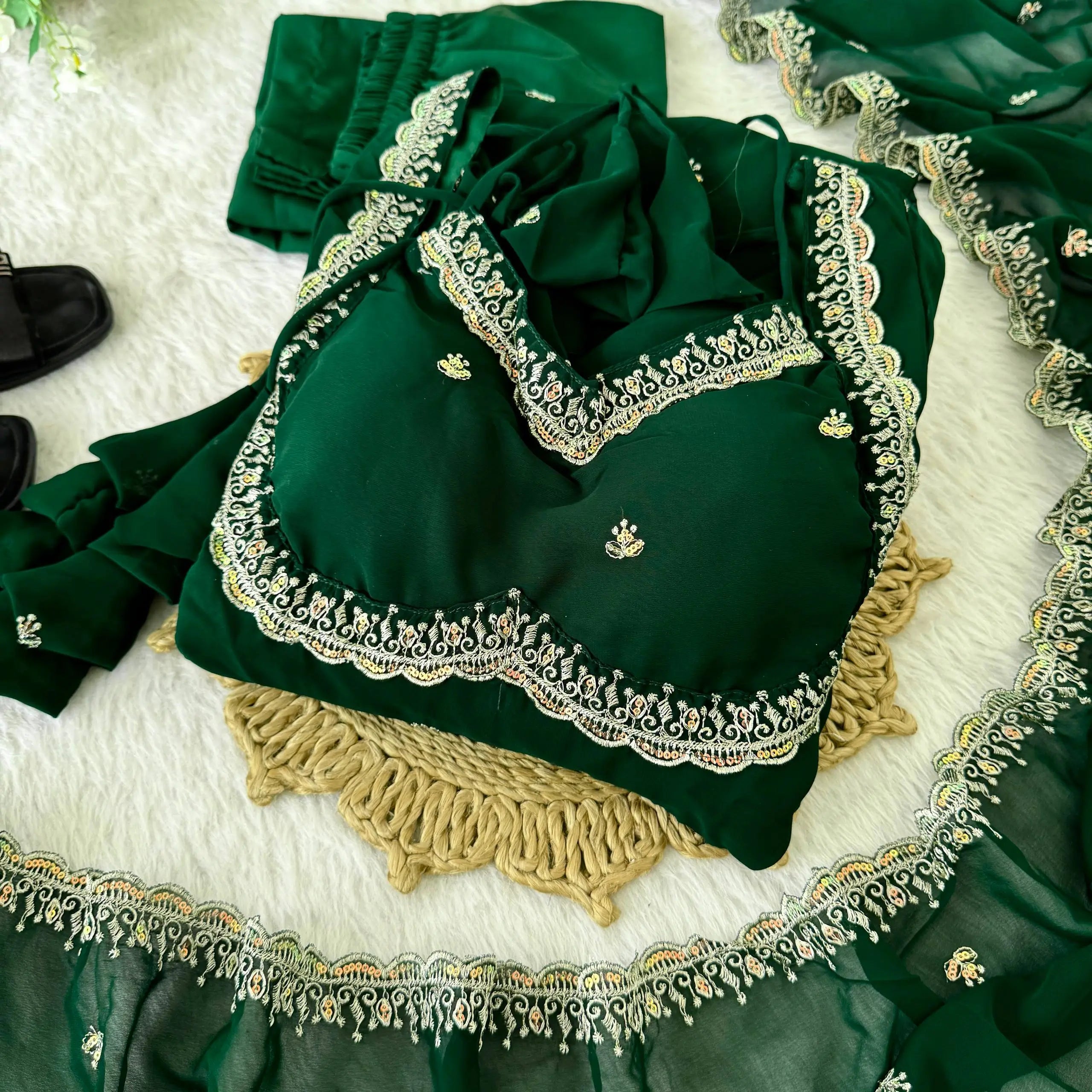 This elegant umbrella gown set is crafted from heavy fox georgette and features intricate rembo sequence embroidery with zari detailing on the neckline and sleeves. The gown includes a soft American butter cotton inner for comfort and structure, paired with a grand four meter umbrella flair that creates a graceful and flowy silhouette.