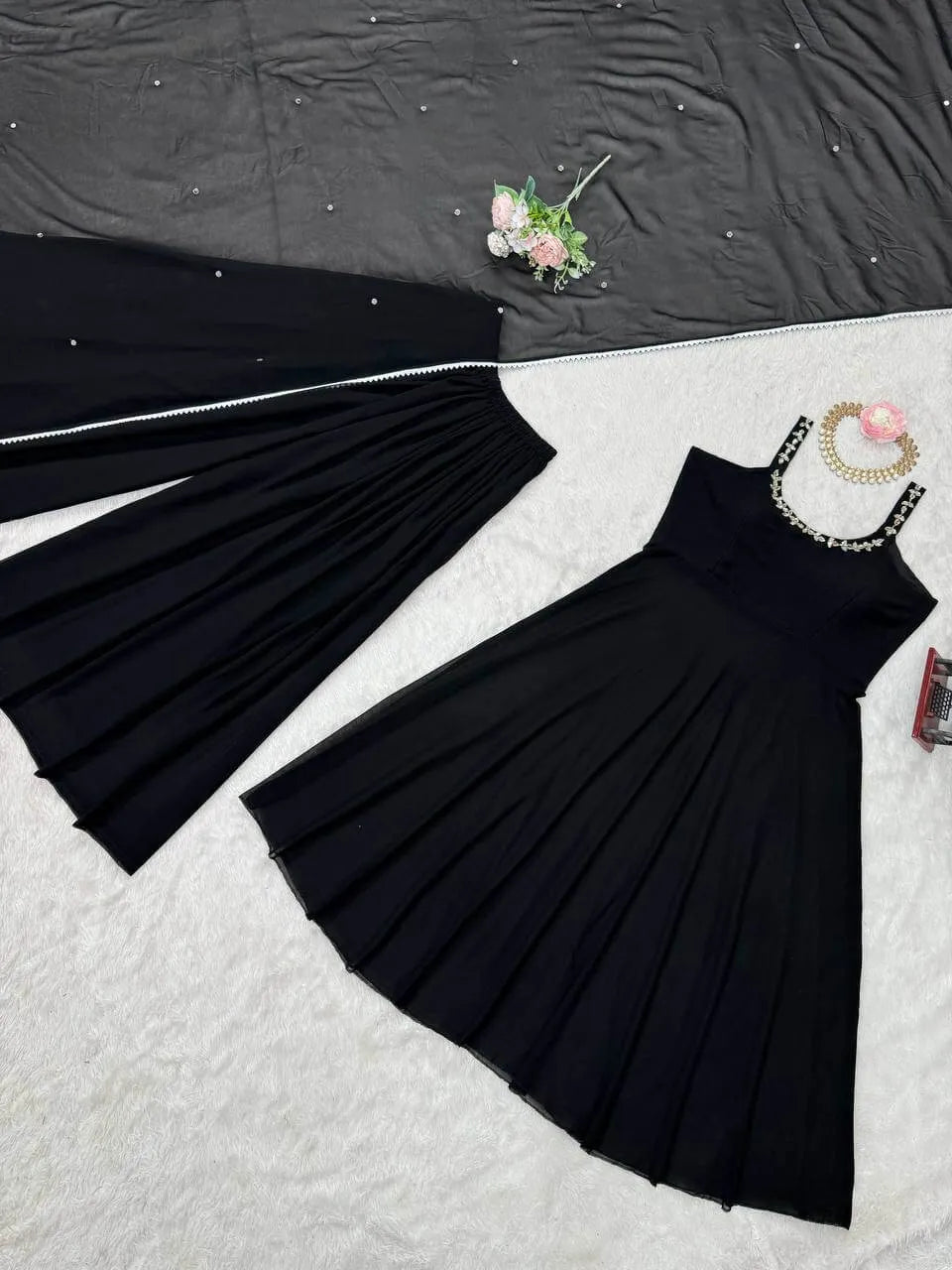The set comes with a fully stitched palazzo in fox georgette, lined with micro fabric and an elastic waistband for easy wear. Adding grace to the outfit is a 2.2-meter fox georgette dupatta, highlighted with a four-side lace border and real mirror work for a touch of sparkle.