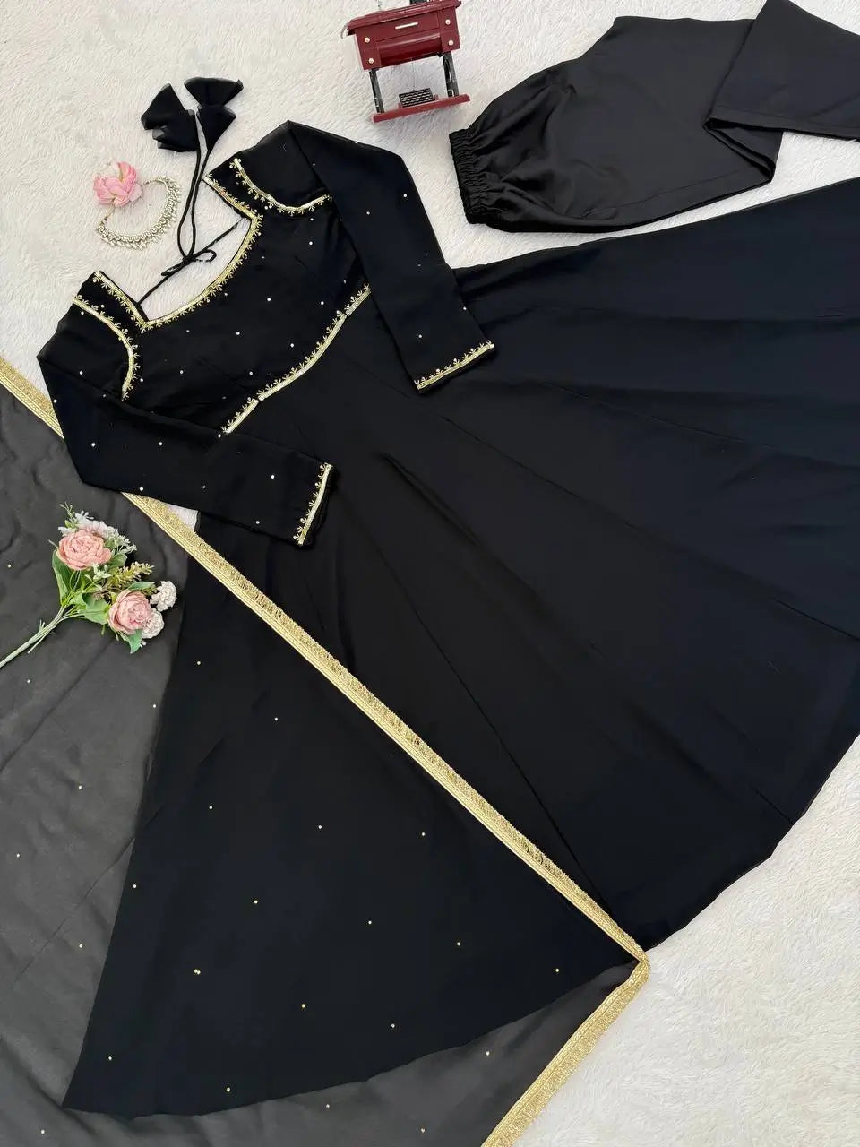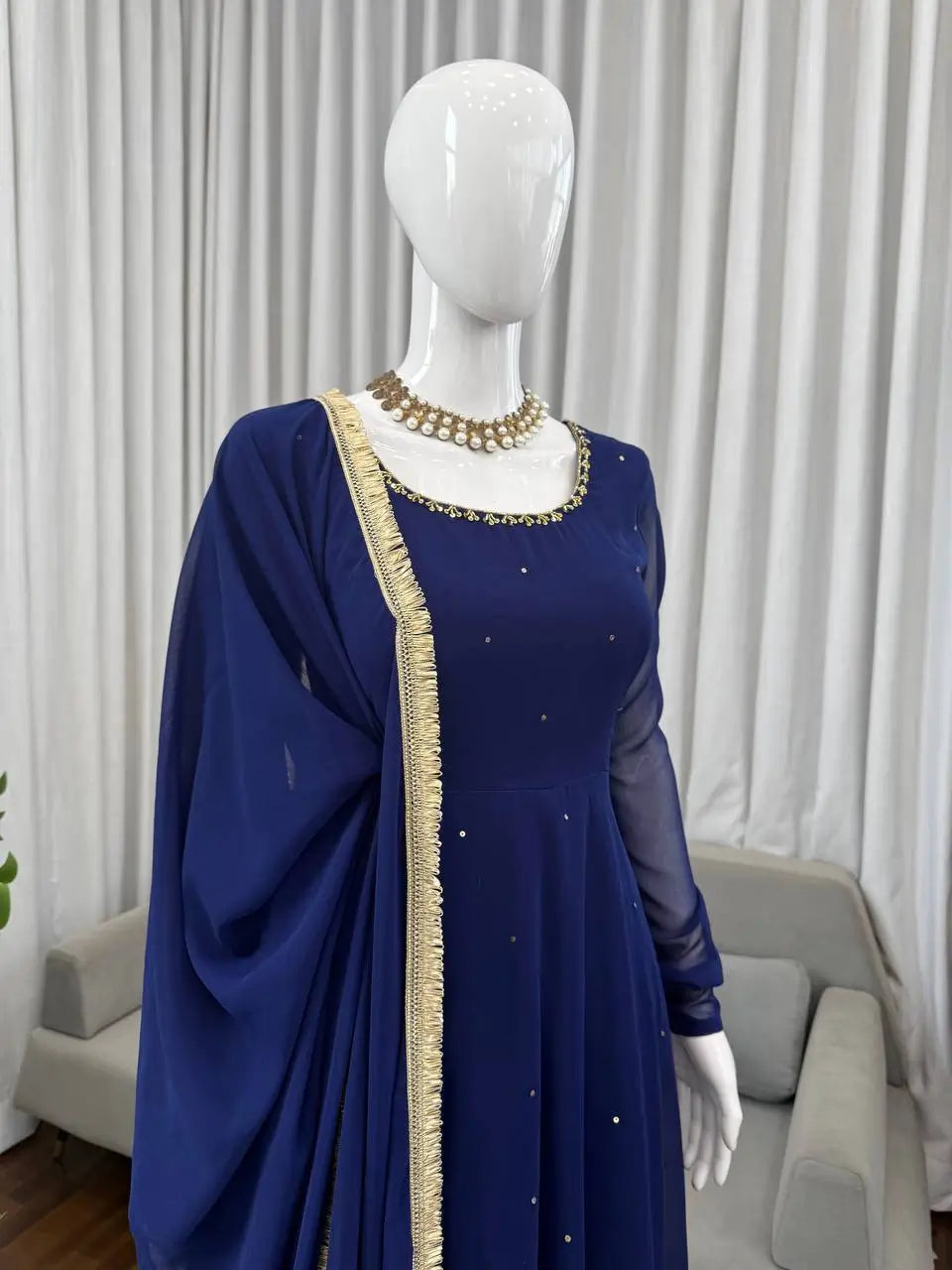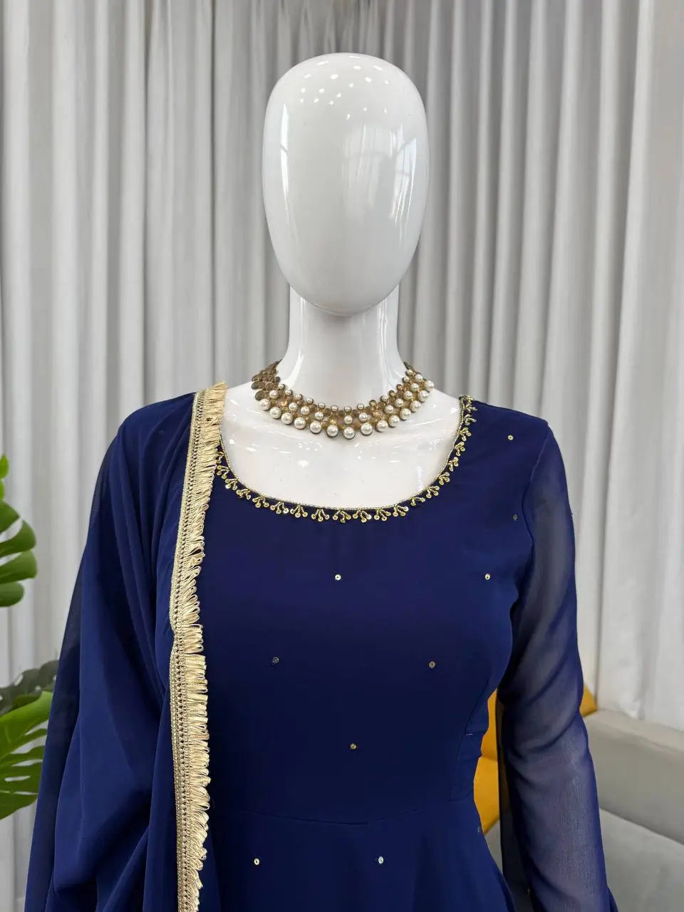 Bring graceful elegance to your ethnic wardrobe with this stunning Navy Blue Faux Georgette Handwork Anarkali Set, designed for women who love royal traditional looks with modern comfort. Crafted from flowy faux georgette fabric, this anarkali is beautifully detailed with handwork embellishment, giving it a classy boutique finish.
