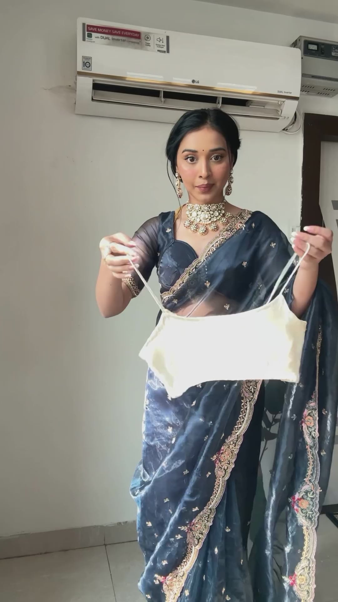 This georgette handwork ready to wear saree is designed for effortless elegance and all-day comfort. The stitched format makes draping extremely easy, while the adjustable waist fitting from 26 inches to 44 inches ensures a comfortable and flexible fit.