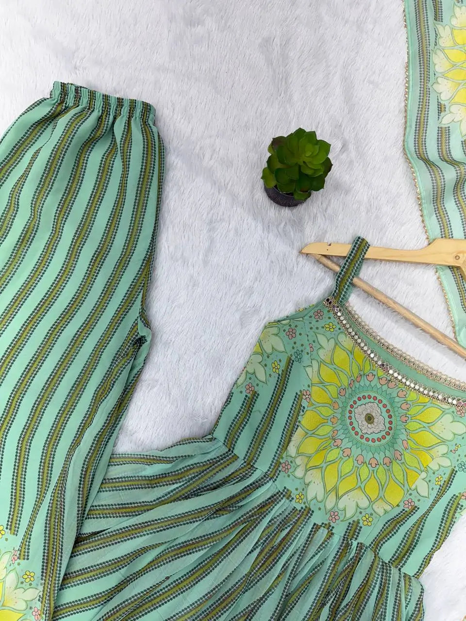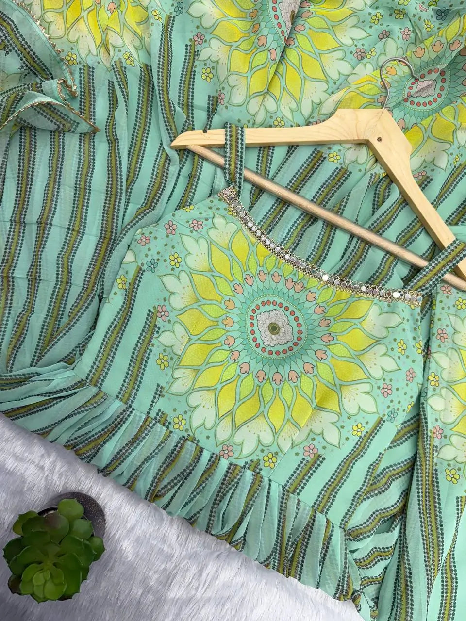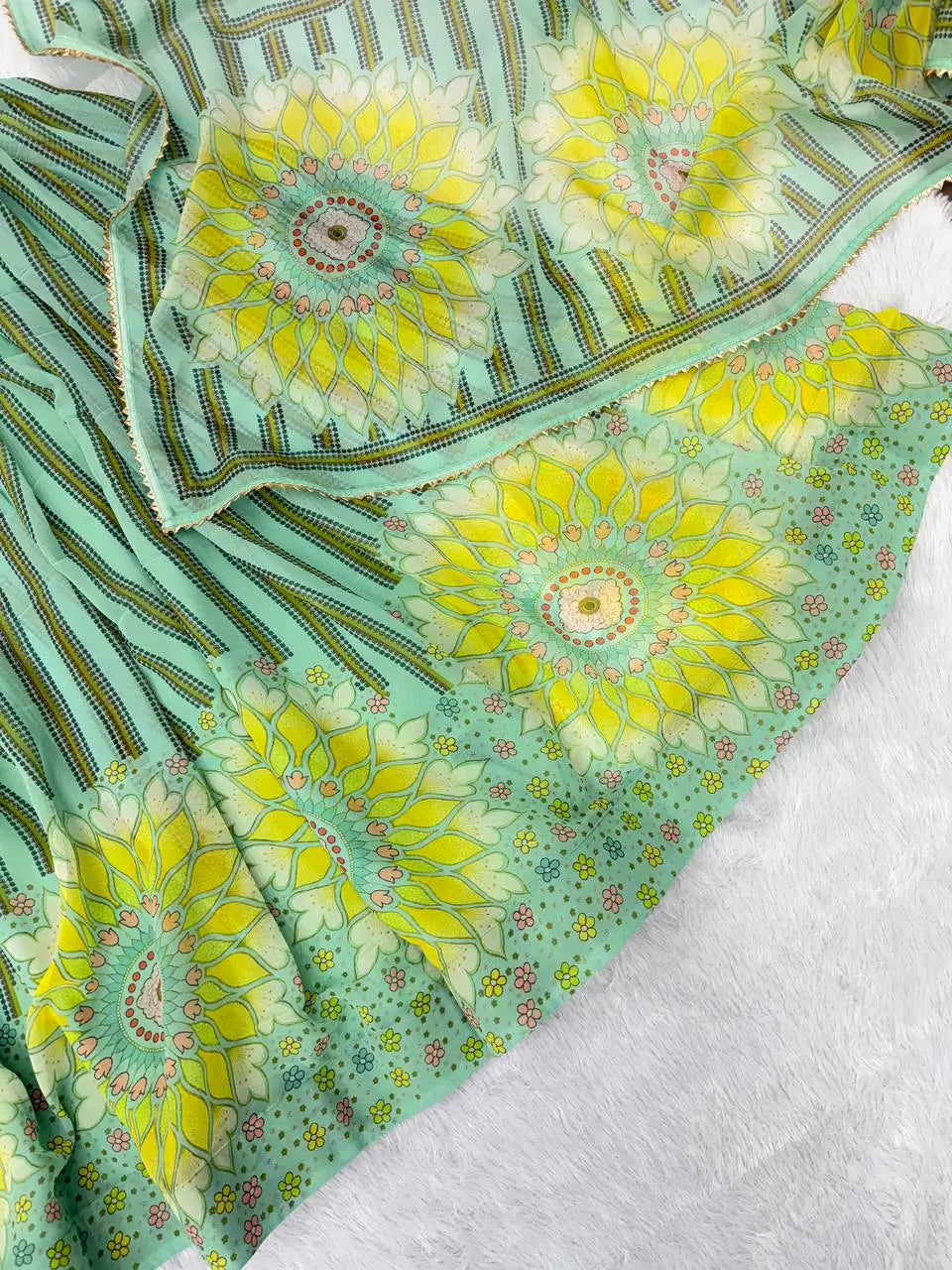 This beautifully crafted Anarkali set is made from pure soft heavy faux georgette featuring a vibrant sunflower lehriya print for a refreshing festive look. The gown offers a graceful silhouette with a four plus meter flair supported by kali cut and canvas patta for added structure. A full micro cotton inner ensures all day comfort while maintaining a flowy drape. The matching free size georgette pant with micro cotton lining provides ease and flexibility. Completing the ensemble is a lightweight organza dupatta with a printed border and lace work, adding an elegant finishing touch. Perfect for festive celebrations, daytime events, family gatherings, and special occasions.