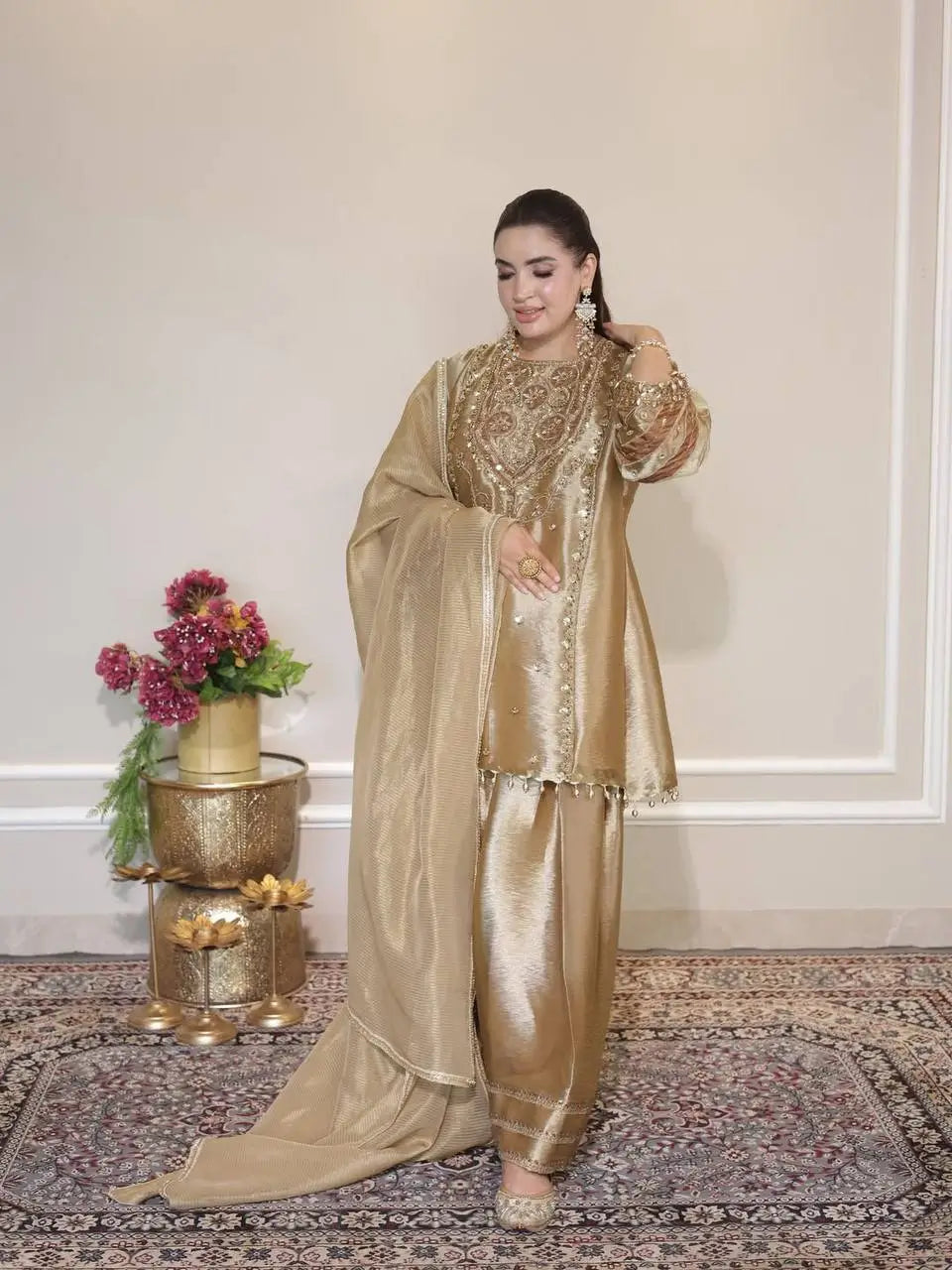 Step into timeless elegance with this luxurious golden Fendy silk embroidered salwar suit set, crafted to bring grace and sophistication to your festive wardrobe. Designed for weddings, festive celebrations, family functions, and special occasions, this outfit beautifully blends subtle shimmer with intricate craftsmanship.