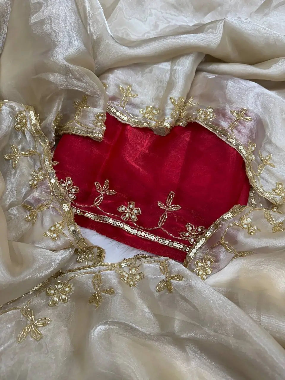 This elegant saree is crafted from soft organza silk, offering a luxurious lightweight drape with a refined sheen. It features beautiful handwork detailing that includes sequins and katdana, adding subtle sparkle and artisanal charm. The delicate craftsmanship enhances the saree’s sophisticated appeal, making it perfect for festive occasions and special celebrations. The blouse is made from matching organza silk and adorned with handwork to complement the saree beautifully. This ensemble blends classic grace with contemporary style, creating a timeless look that suits both modern and traditional events.