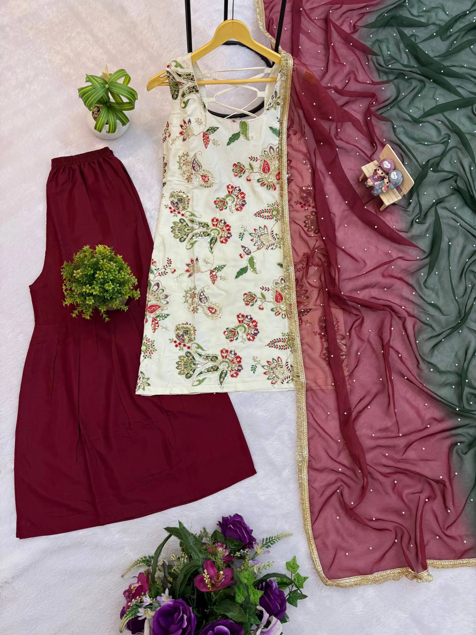 Add elegance and charm to your festive wardrobe with this premium Ivory Natural Silk Kurti Sharara Set, designed for women who love classy ethnic looks with modern comfort. Made from rich natural silk fabric, the kurti features detailed front & back embroidery work, along with a stylish back drawstring pattern that gives a flattering adjustable fit.