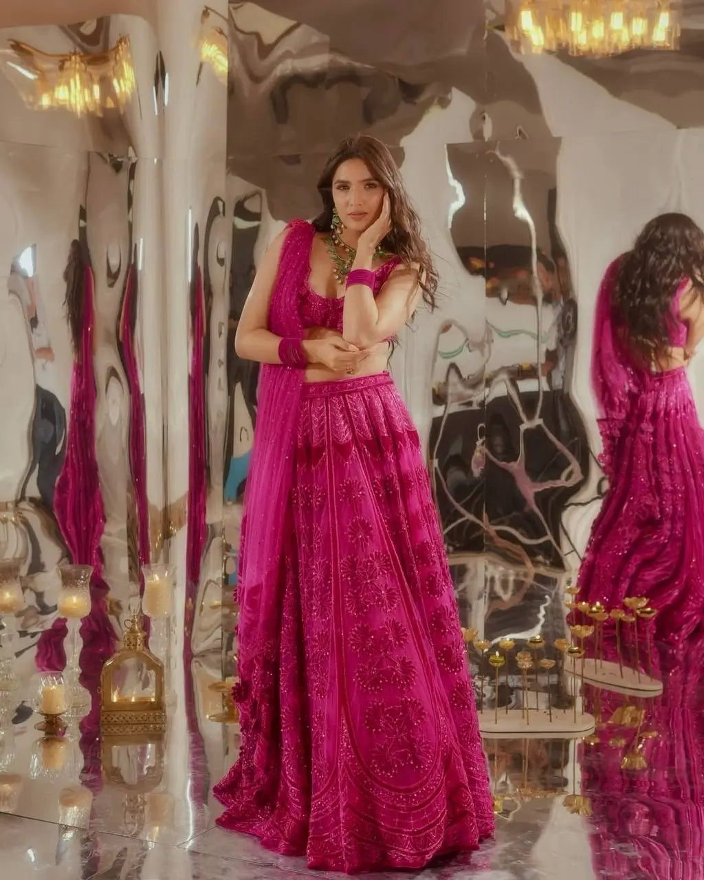 • Kasturi silk lehenga with detailed thread, sequins and dori embroidery