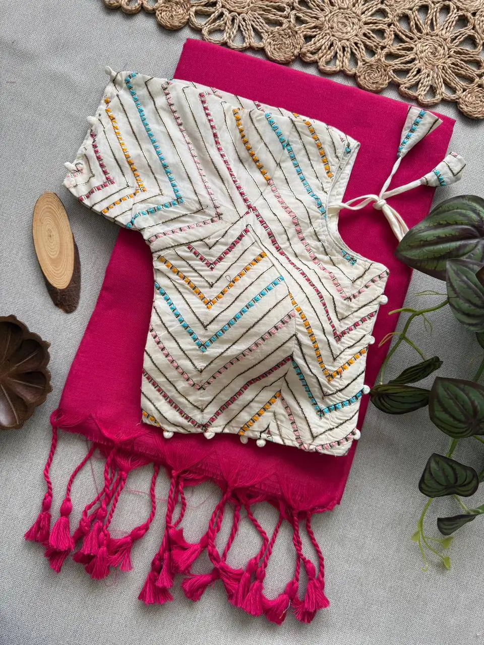This elegant saree set is crafted from pure khadi cotton, offering a light, breathable and comfortable drape ideal for daily wear, festive gatherings and elegant casual styling. The saree features a soft textured finish along with statement tassels on the pallu for a handcrafted appeal. Paired with it is a beautifully designed embroidered blouse made from premium aura cotton, padded and finished with pure cotton lining for added comfort and structure. The blouse is fully alterable from size 38 to 42 and includes a secure hook closure. Versatile and easy to match, the blouse pairs well with any color khadi cotton saree, making this set a stylish and practical addition to your wardrobe.