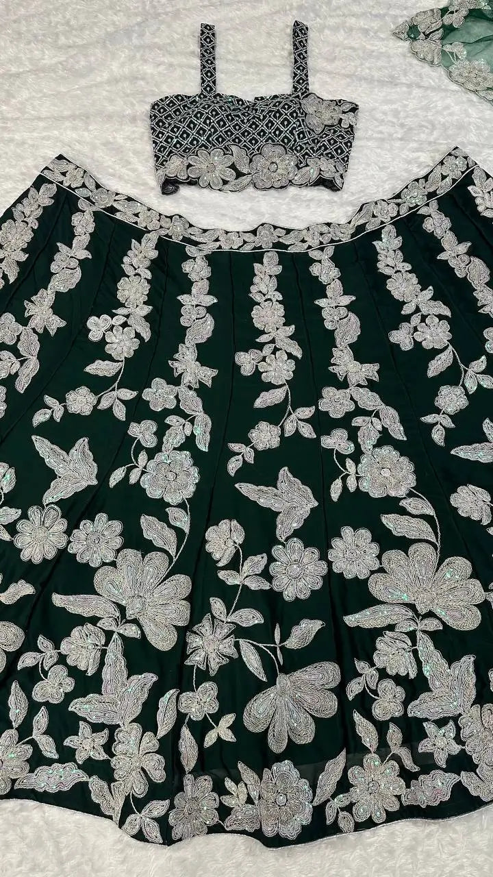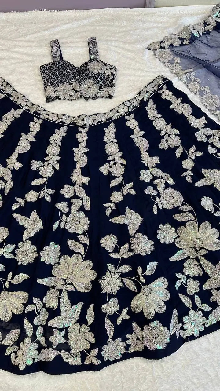 • Heavy malai satin lehenga with sequins and dori embroidered floral pattern