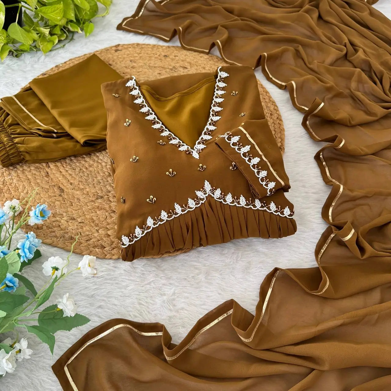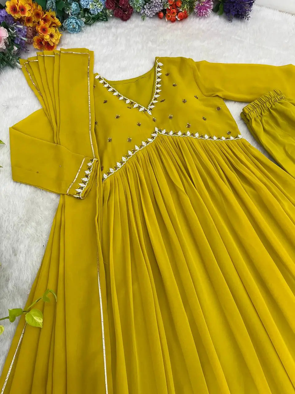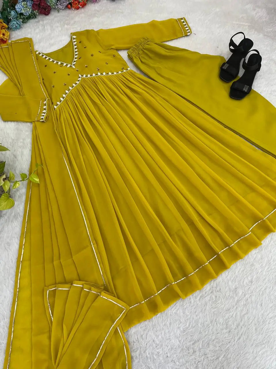 The set comes complete with a matching fox georgette dupatta finished with a four-side golden gotta lace border and a butter cotton pant, making it a ready-to-wear ensemble that blends style with comfort.