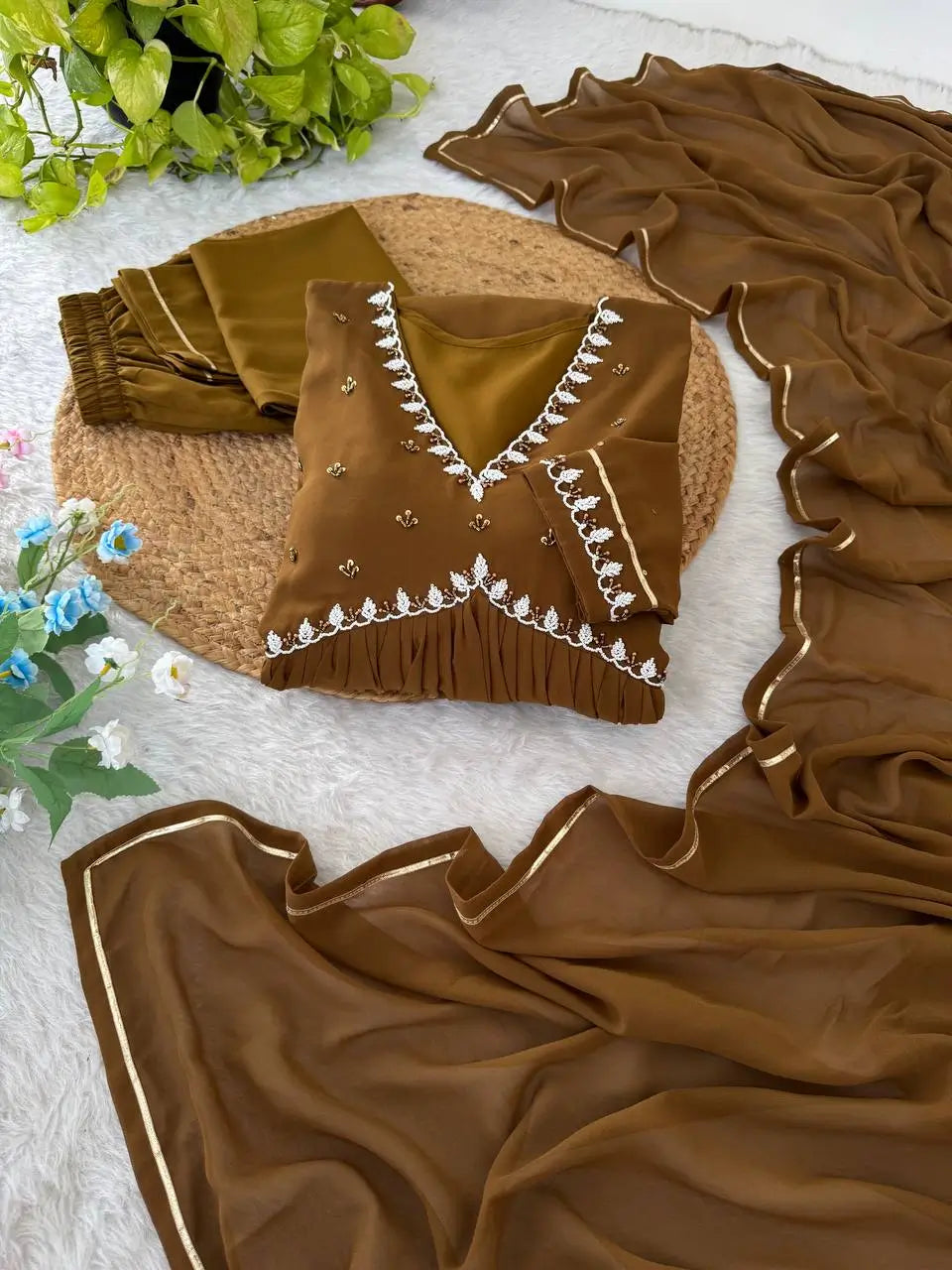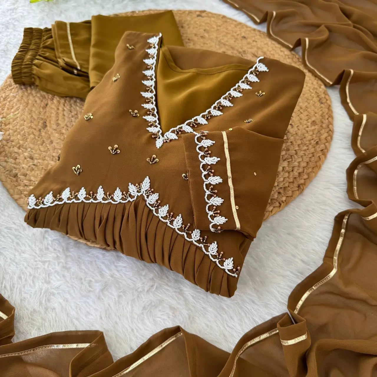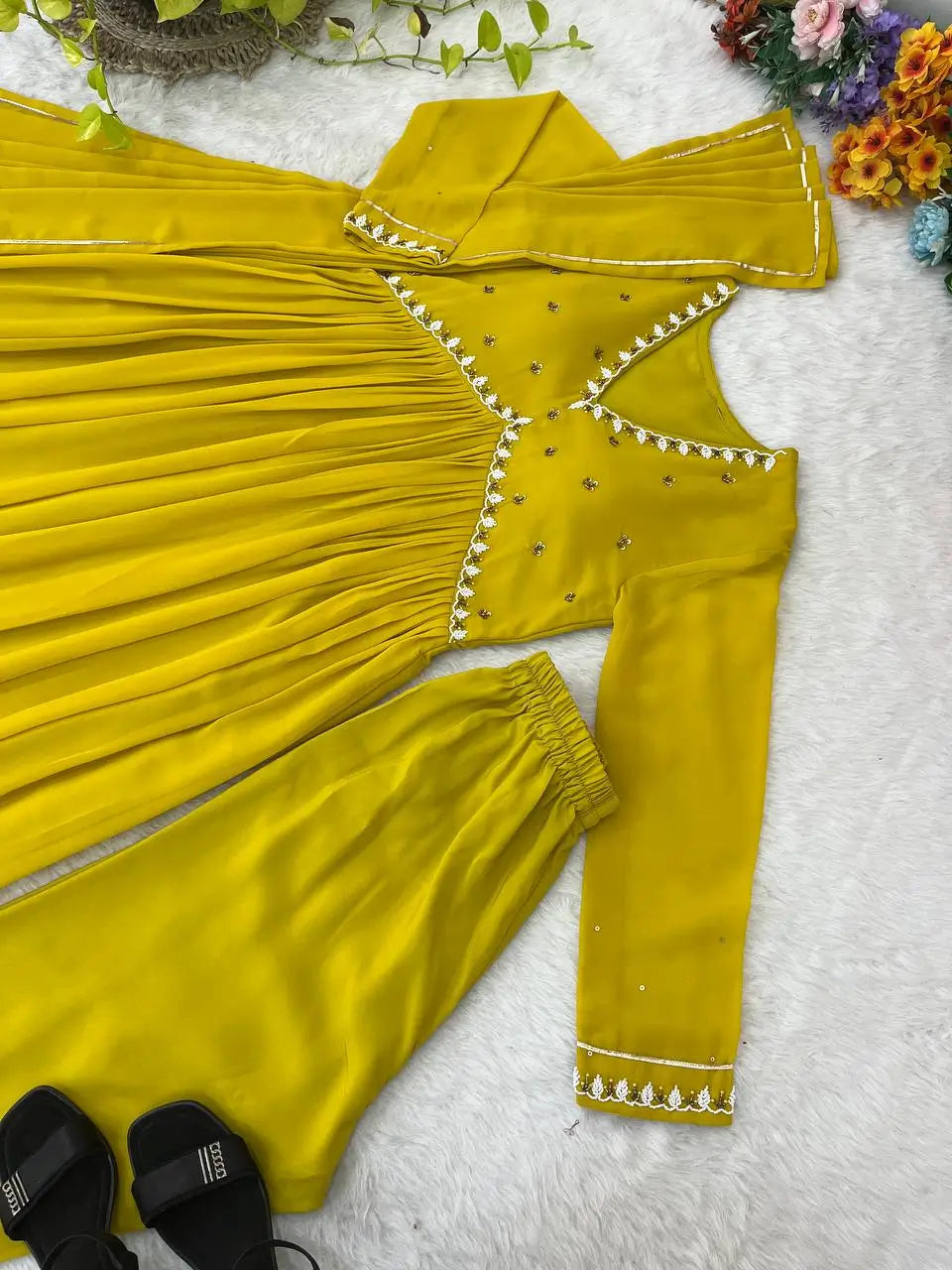 The set comes complete with a matching fox georgette dupatta finished with a four-side golden gotta lace border and a butter cotton pant, making it a ready-to-wear ensemble that blends style with comfort.
