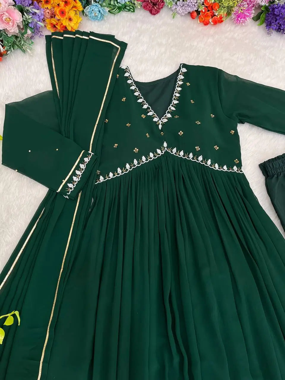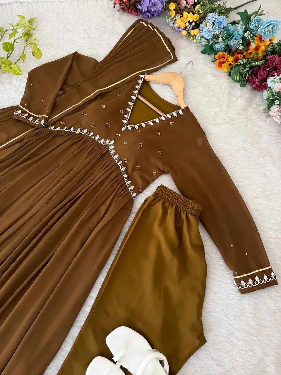 Grace your special occasions with this sophisticated mauve Anarkali gown set, crafted in premium fox georgette fabric. Designed with a flowy 4-meter flair and full sleeves, this gown combines elegance with comfort. The heavy butter cotton lining ensures a smooth fit, while delicate embroidery and finishing add a refined touch. With a length of 48–50 inches, it drapes beautifully for weddings, receptions, and festive gatherings.