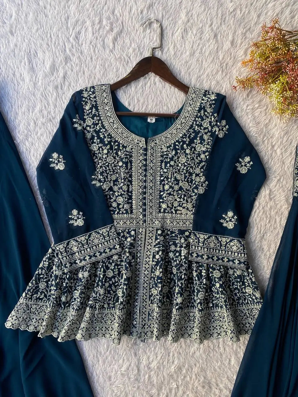 The palazzo is crafted in plain georgette, allowing easy movement and balanced volume, while the dupatta is finished with matching embroidered detailing that ties the entire look together. The overall craftsmanship reflects a blend of modern styling and classic Indian embroidery.