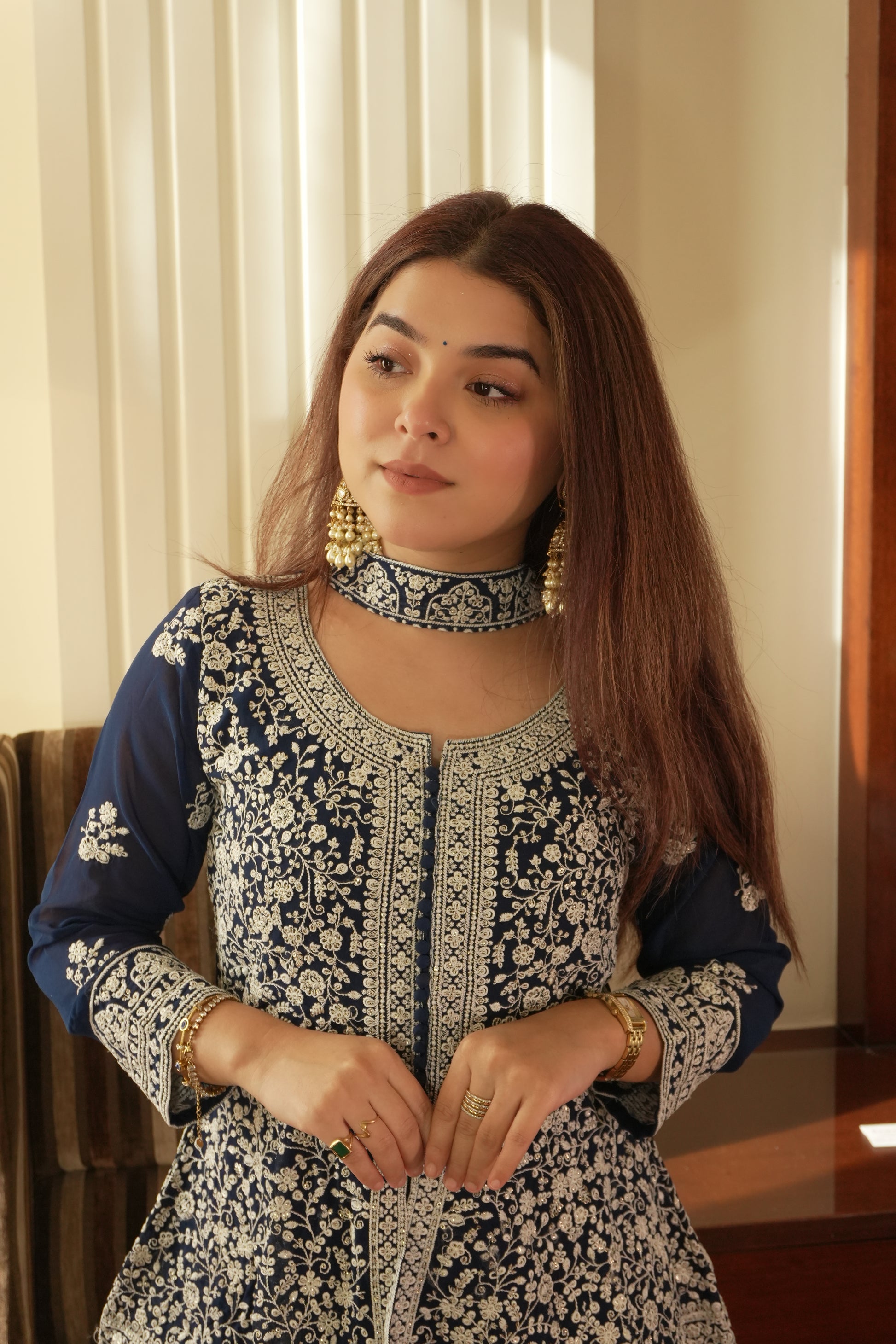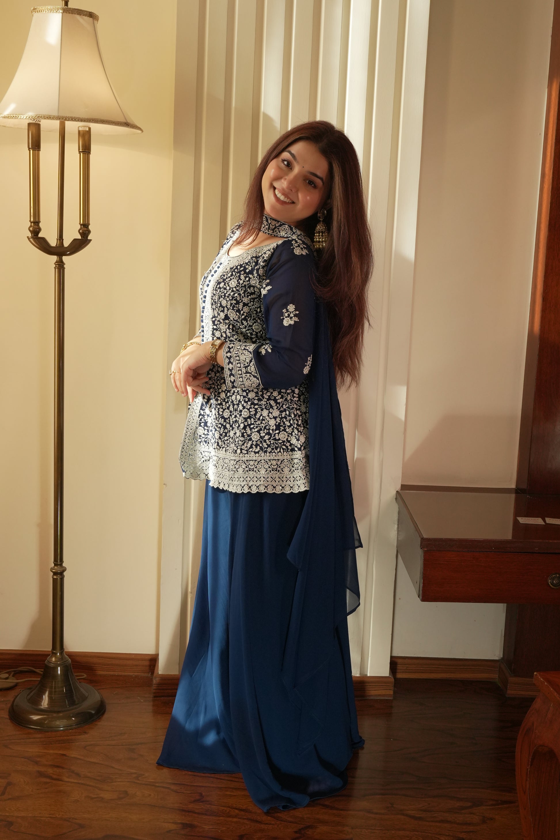 The midnight blue shade is deep, rich, and elegant, making it an excellent choice for evening weddings and festive events. Under warm lighting, the color looks luxurious and flattering on Indian skin tones. The contrast of white embroidery against the blue base enhances the detailing, giving the outfit a standout yet graceful appearance.