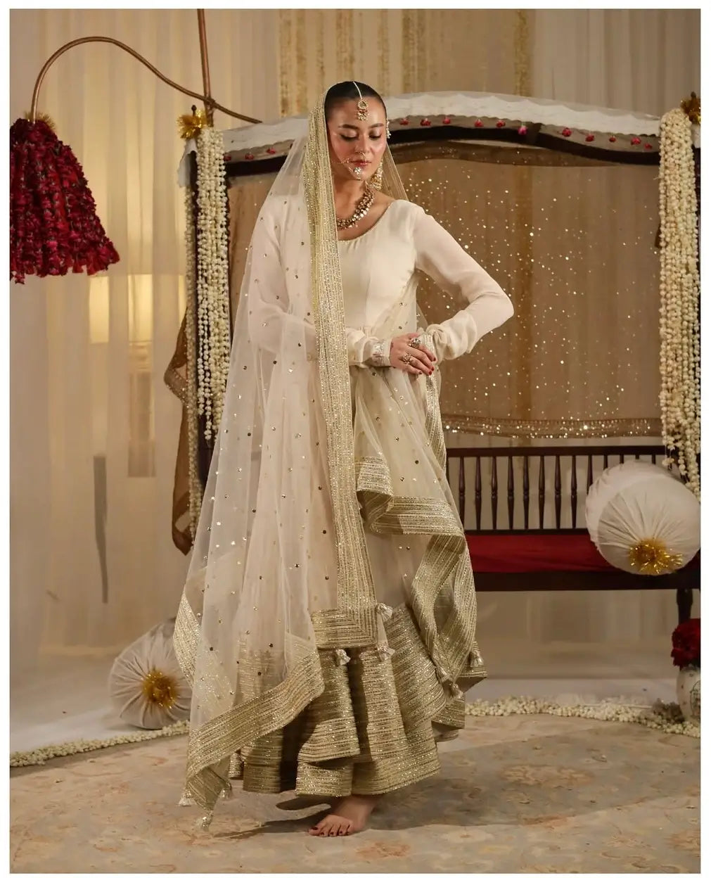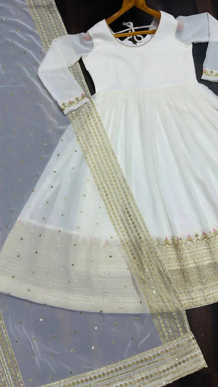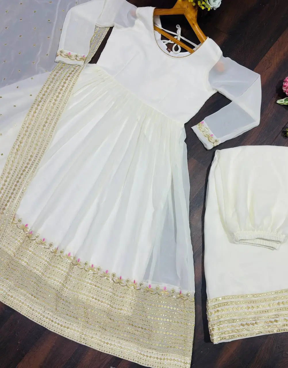 beautifully enhanced with heavy 3 mm sequins and zari thread embroidery. Designed in a soft off white shade, the ensemble reflects timeless grace, making it a perfect choice for festive celebrations, wedding functions, and special occasions. The kurta features full sleeves and a flowing silhouette, paired with a matching embroidered plazo that adds movement and elegance to the overall look.
