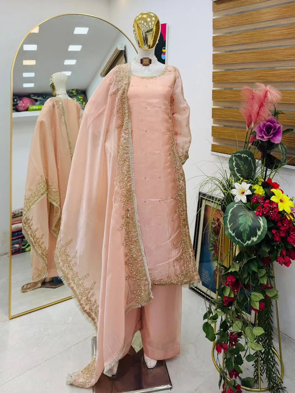 Elevate your festive wardrobe with this graceful organza silk palazzo suit set crafted for timeless elegance. The top is designed in premium organza silk and beautifully adorned with intricate embroidery, sequence, moti, and lace detailing that adds a soft shimmer and refined finish. The round neckline and full sleeves enhance its classic appeal, making it suitable for both daytime and evening occasions.