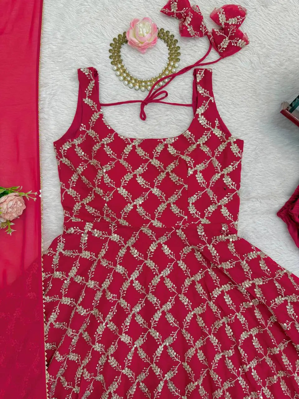 The gown is made from heavy fox georgette with embroidery and sequin work, while the dupatta is crafted from soft net with bead detailing.