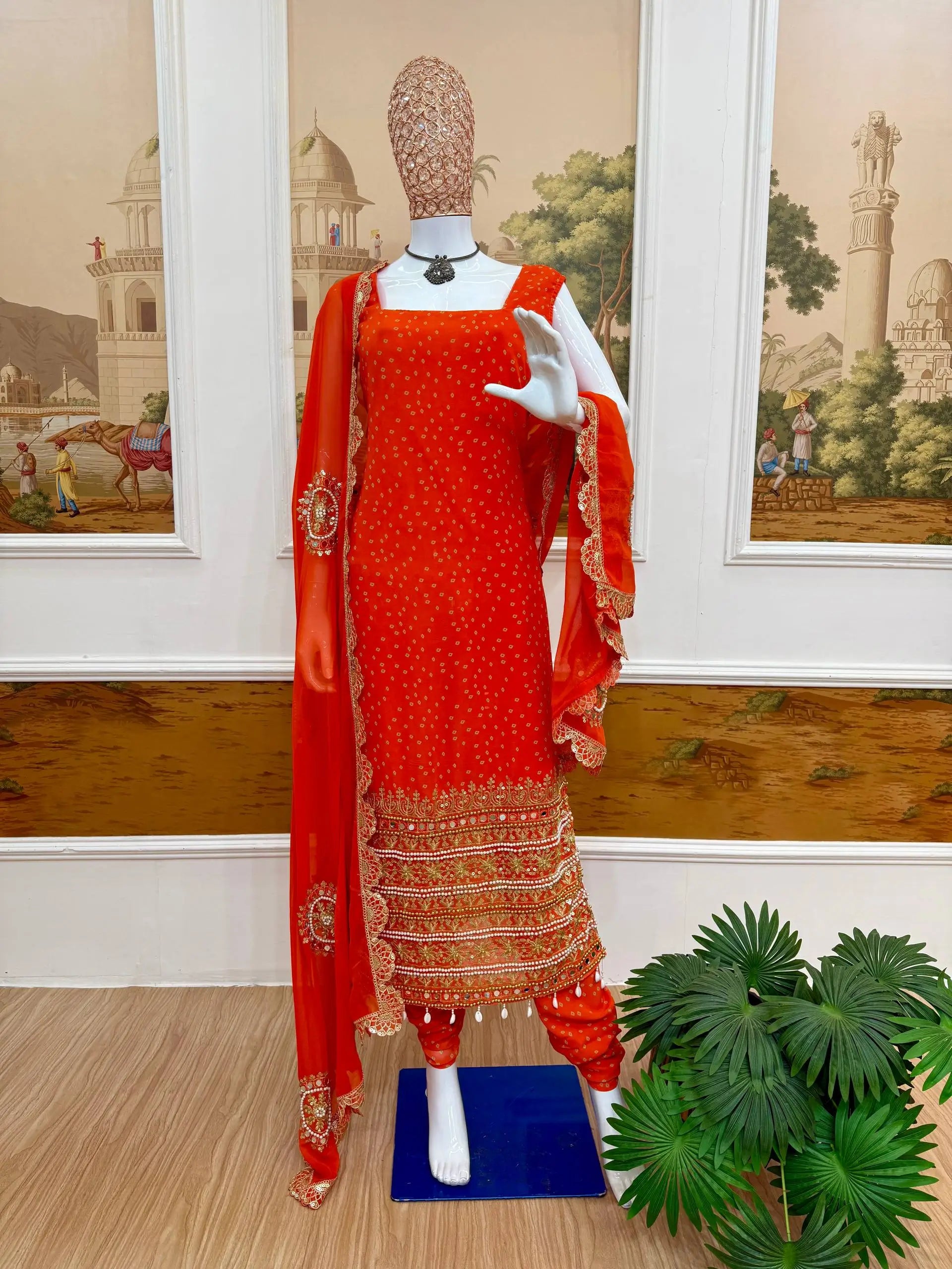 This elegant suit set is designed in soft bandhani faux georgette and detailed with pearl moti and real mirror hand work on the daman for a rich festive look. The kurti features fine embroidery and comes with a comfortable micron inner for smooth wear. It is paired with a faux georgette churidar made to ensure ease of movement with an adjustable waistband. The set includes a beautifully crafted faux georgette dupatta featuring matching pearl and mirror hand work that completes the traditional yet modern aesthetic. This premium quality ensemble is ideal for festive functions, gatherings and special occasions.