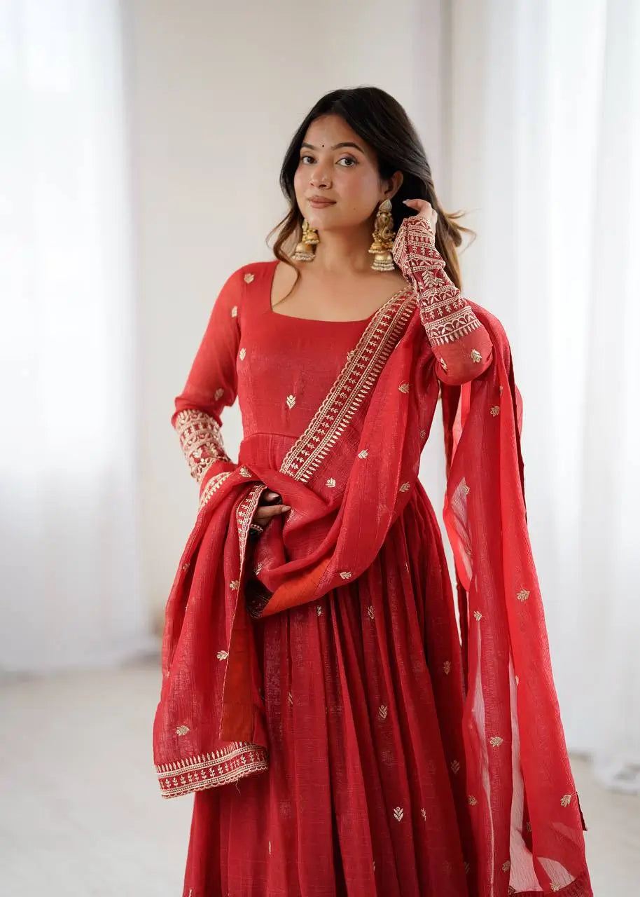 This elegant Anarkali gown set is crafted from heavy pure crunchy silk fabric that provides a rich drape, smooth texture and refined festive appeal. The gown features full churidar sleeves adorned with intricate embroidery, jari detailing and sequence work that enhances its traditional charm. The bottom border showcases coordinated embroidery for a graceful and balanced look. Designed with a comfortable pure micro scrape lining, the gown ensures ease of movement while maintaining structure. The set includes a matching dupatta made from the same luxurious crunchy silk, highlighted with handwork bead embellishments, embroidery and a fancy border for a complete celebratory ensemble. The back tassels and side zipper add convenience and style, making this outfit perfect for festive events, weddings and special gatherings.