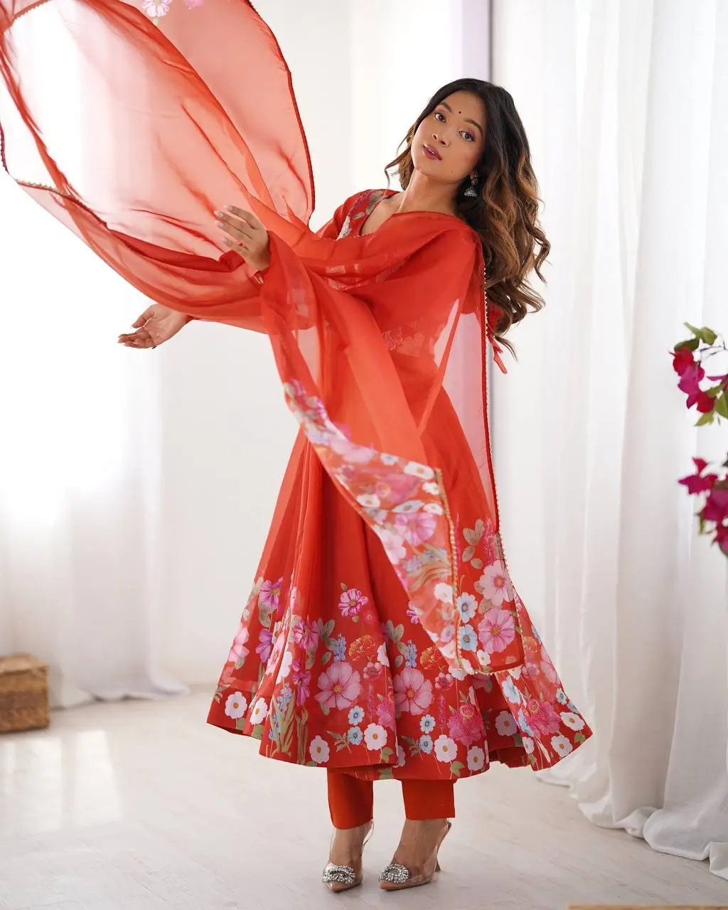 The Anarkali comes with full-length sleeves, padding, and a concealed zipper, ensuring a seamless and comfortable fit. It includes a pure micro cotton inner lining for softness and ease of movement. The look is completed with a 2.3-meter Organza Silk dupatta, delicately bordered with gota patti lace work, adding a festive touch. The accompanying ready-to-wear micro cotton silk pant enhances the outfit’s comfort and wearability.