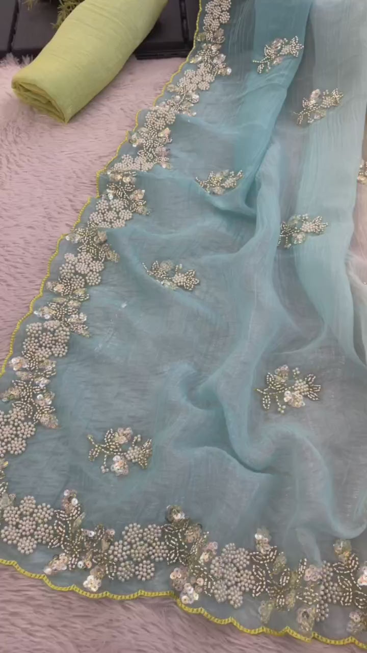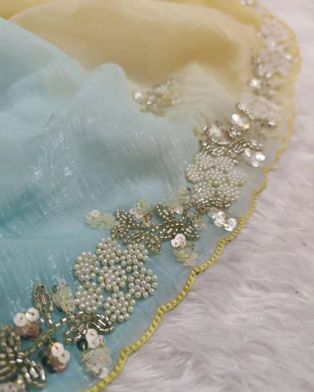 This elegant Pixel Crush saree is crafted to offer a refined blend of softness, style and festive charm. Designed with premium cutdana, moti and sequins work, it creates a graceful shimmer that enhances every movement. The dual-tone drape adds a refreshing contemporary touch while maintaining a traditional aesthetic.