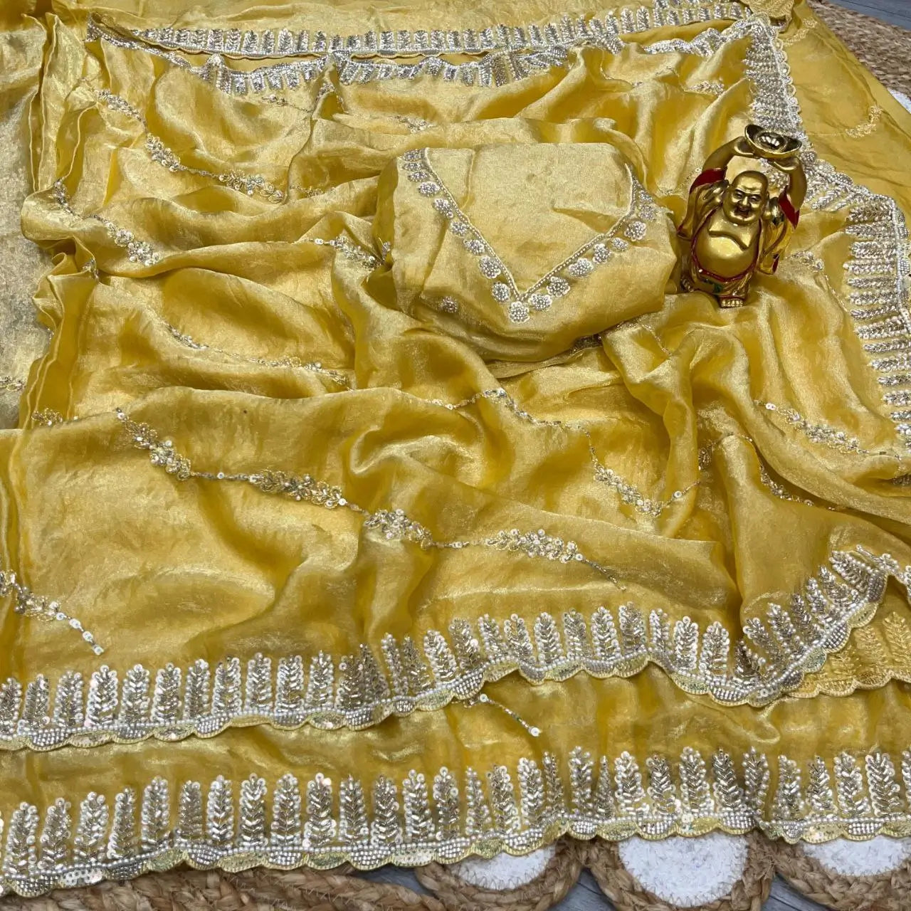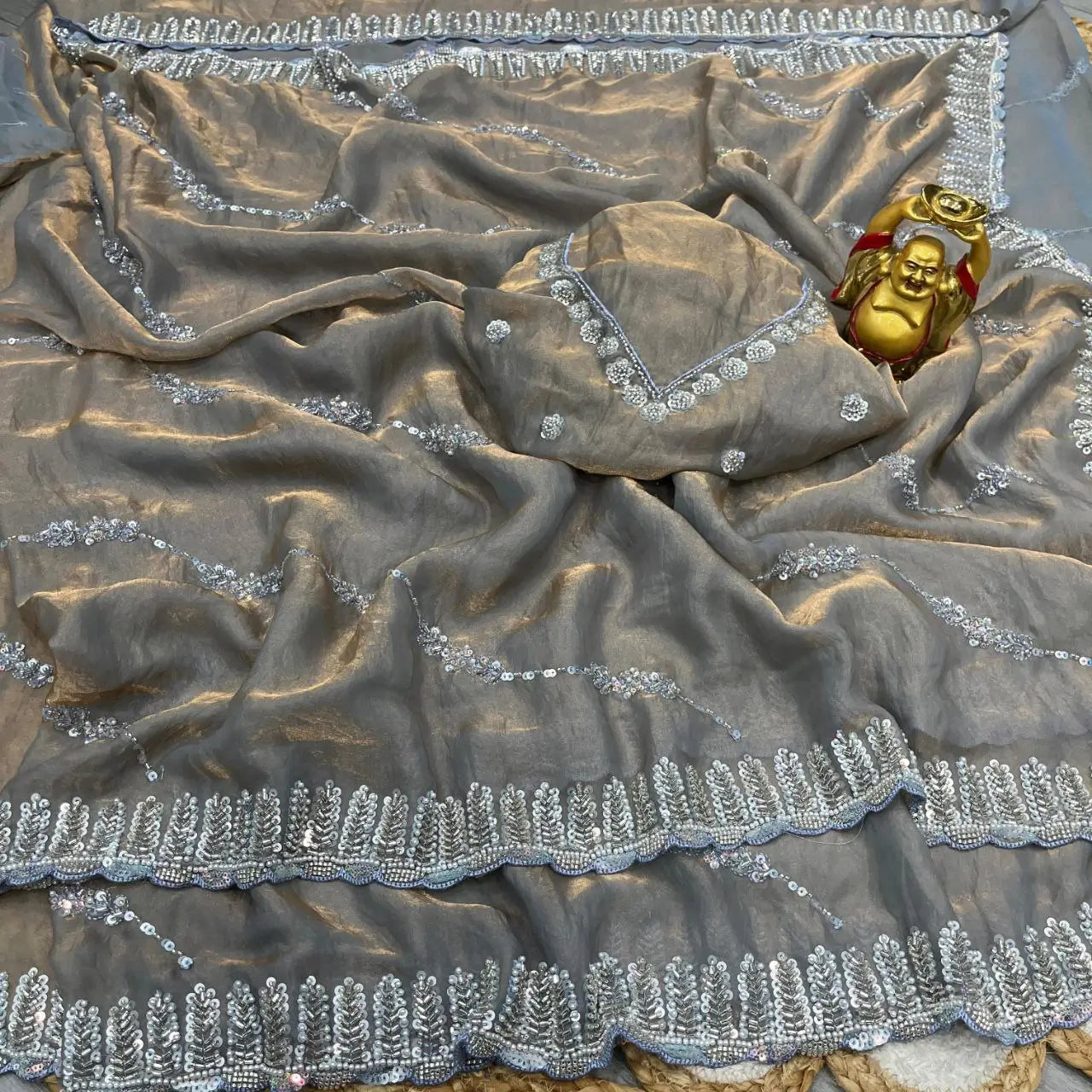 This luxurious saree is crafted from high-quality space silk, known for its soft texture, elegant sheen and smooth drape. The saree is beautifully embellished with original beads work placed delicately across the drape and the border, creating a refined and festive look. The set includes a matching space silk blouse piece featuring coordinated beads work, allowing you to achieve a cohesive and sophisticated finish. With a comfortable 5.50 meter saree length, this ensemble is perfect for weddings, festive functions and special celebrations. Lightweight yet richly detailed, it combines premium craftsmanship with timeless elegance.