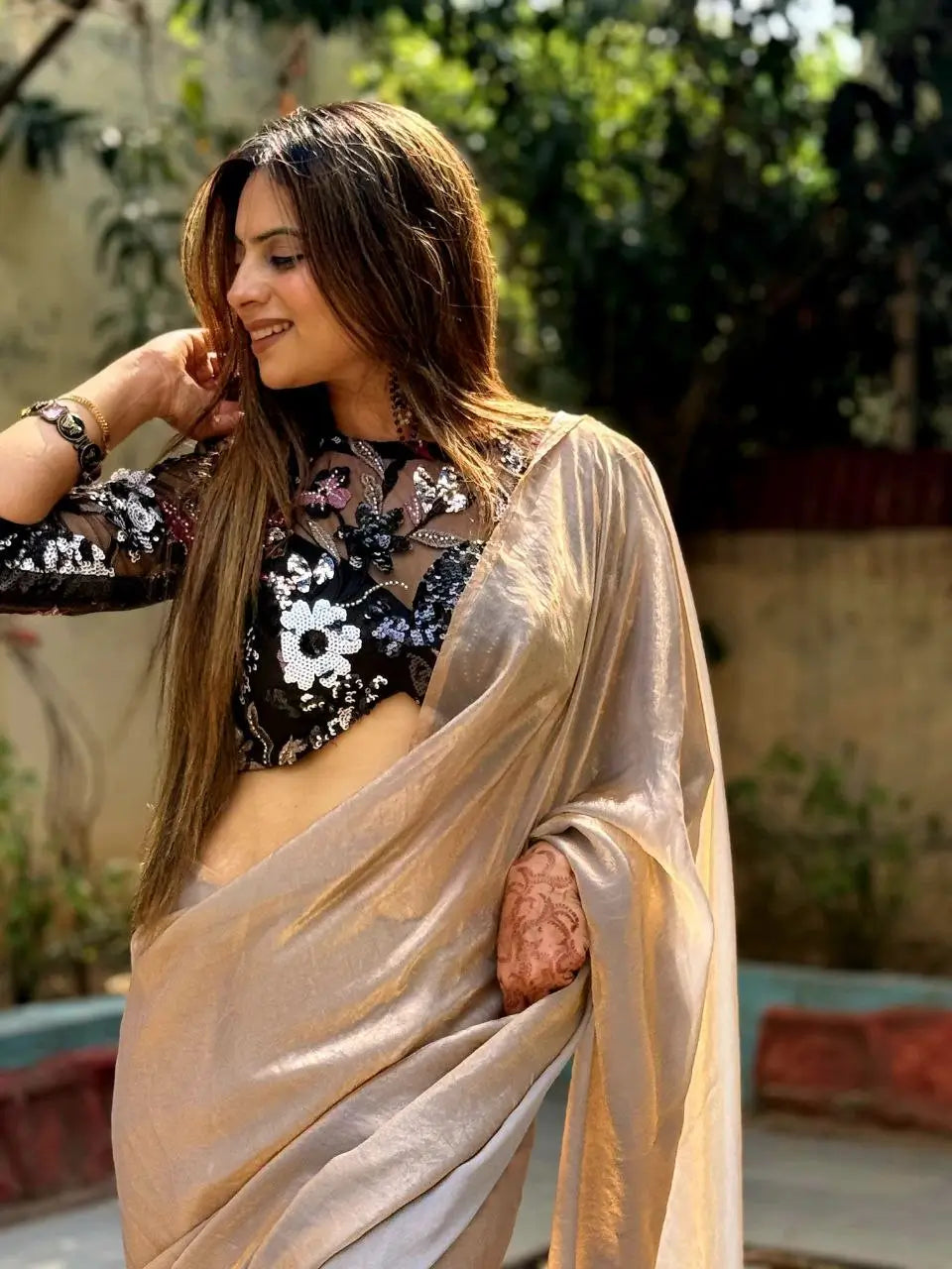This elegant saree is crafted from pure space silk, known for its soft texture, fluid drape and natural sheen. The lightweight fabric ensures refined comfort while offering a graceful fall suitable for both daytime and evening occasions. Paired with the saree is a beautifully crafted designer blouse featuring sequins and beads work, adding a stylish touch of sparkle that enhances the overall look. The blouse comes unstitched, allowing a perfect personalized fit. Ideal for festive events, functions and special gatherings, this saree effortlessly blends sophistication with contemporary charm.