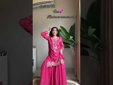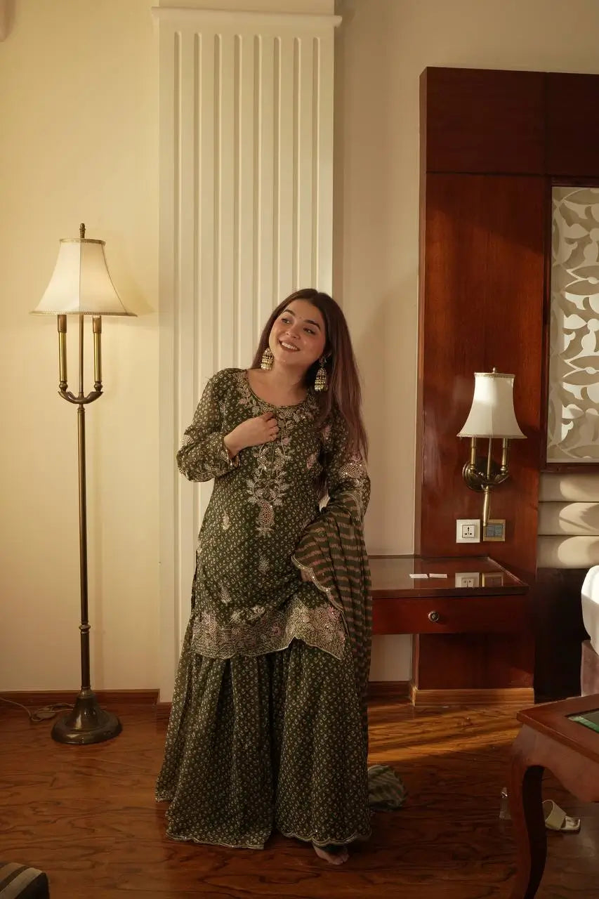 Add effortless charm to your festive collection with this elegant printed chinon sharara set designed to shine at every celebration. Crafted from premium printed chinon fabric, the kurti features intricate embroidery work on both the front and back, enhanced with delicate diamond work that adds a subtle festive sparkle.