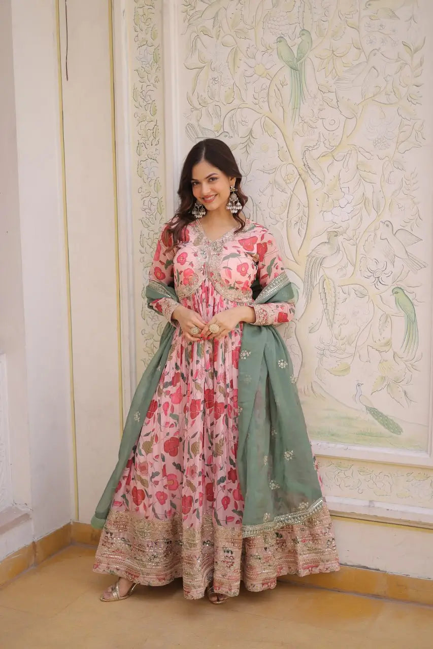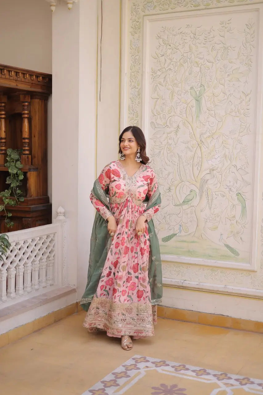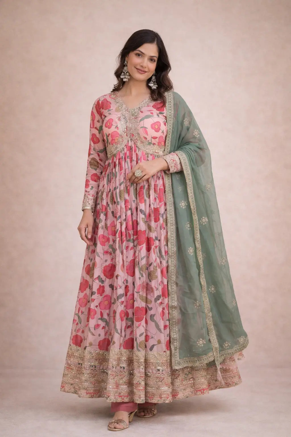 This elegant Anarkali gown is crafted from premium digital printed Russian silk, designed to deliver a graceful drape with a refined festive appeal. The gown features intricate embroidery with zari and sequins work that enhances the richness of the print while maintaining a balanced and sophisticated look. Styled with a fancy V neck and full sleeves, the outfit offers a flattering silhouette complemented by a wide flare for effortless movement. It is fully lined with soft cotton from top to bottom, ensuring comfort throughout the day. The ensemble is paired with a matching Russian silk dupatta adorned with sequins embroidery and a designer lace border, completing the look with timeless elegance. This outfit is an ideal choice for festive celebrations, family functions, and special occasions.