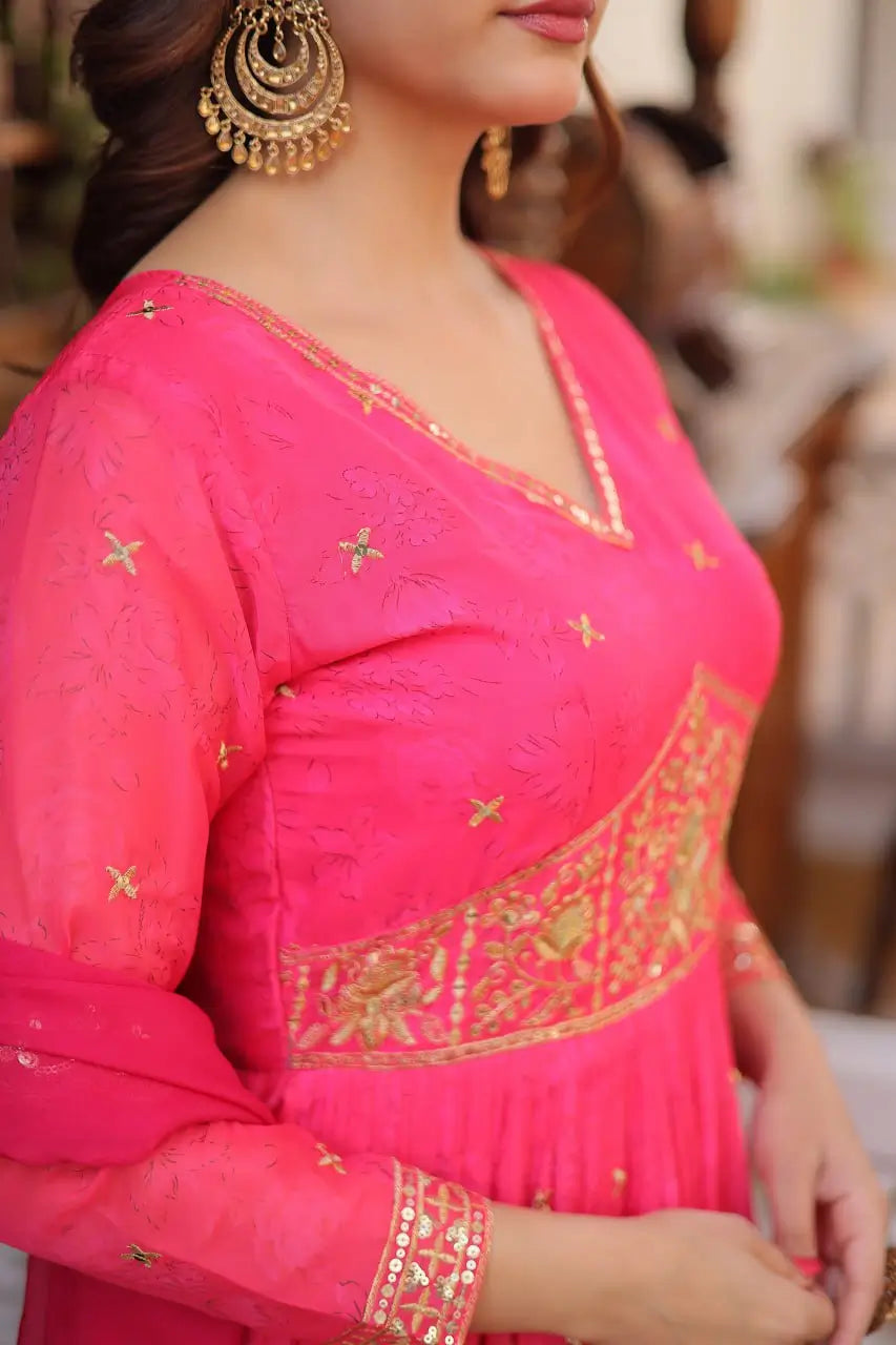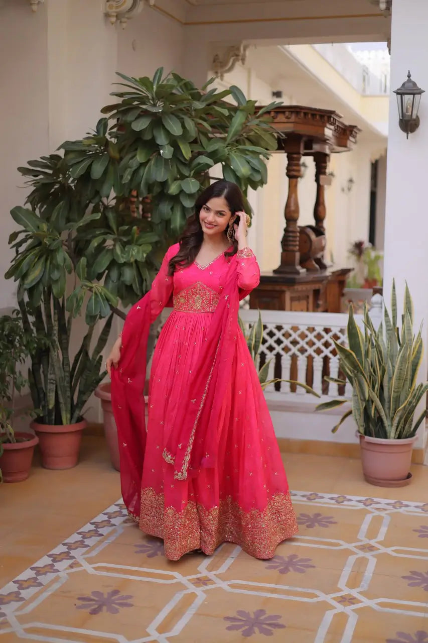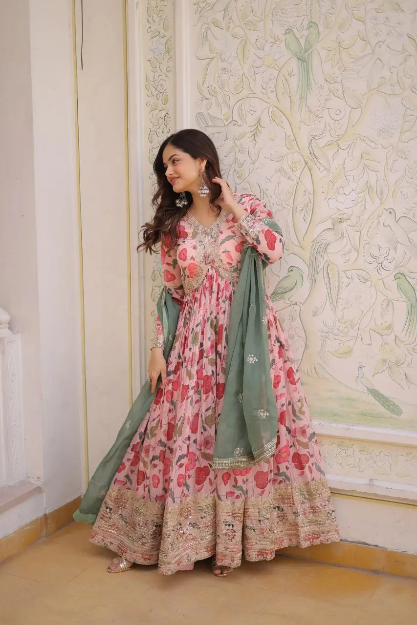 This elegant Anarkali gown is crafted from premium digital printed Russian silk, designed to deliver a graceful drape with a refined festive appeal. The gown features intricate embroidery with zari and sequins work that enhances the richness of the print while maintaining a balanced and sophisticated look. Styled with a fancy V neck and full sleeves, the outfit offers a flattering silhouette complemented by a wide flare for effortless movement. It is fully lined with soft cotton from top to bottom, ensuring comfort throughout the day. The ensemble is paired with a matching Russian silk dupatta adorned with sequins embroidery and a designer lace border, completing the look with timeless elegance. This outfit is an ideal choice for festive celebrations, family functions, and special occasions.