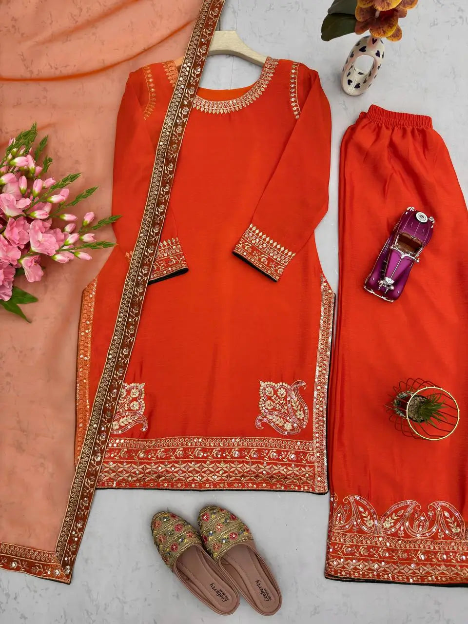 Radiate timeless elegance with this luxurious suit set crafted from pure Chinon silk fabric. The kurta features exquisite embroidery with sequin and zari work on the yoke, sleeves, and hemline, creating a refined yet festive look. The subtle shimmer of the fabric paired with intricate detailing makes it a perfect choice for weddings, festive gatherings, and elegant celebrations.